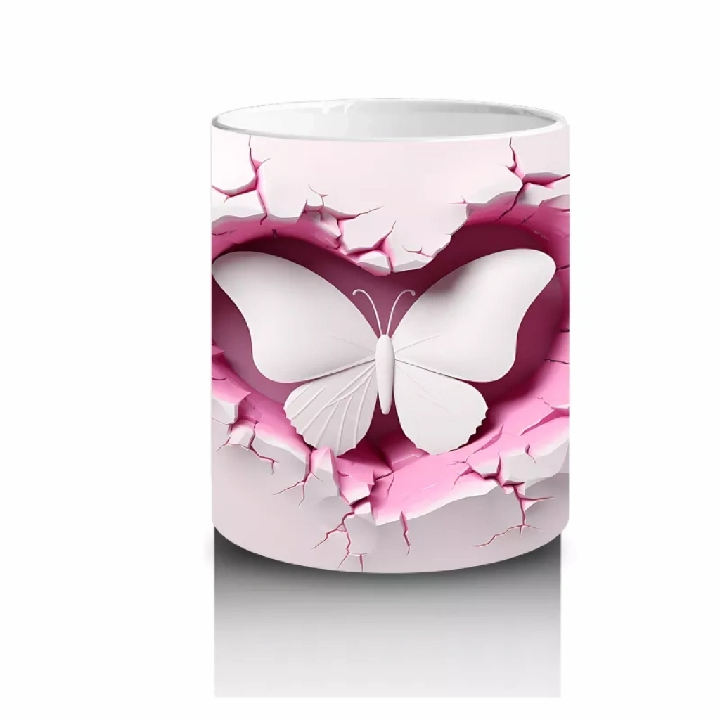 Kalp şeklindeki çatlak zeminden yükselen beyaz kelebek, umut ve özgürlüğü simgeliyor. Nazik ve estetik detayları sevenler için ideal bir tasarım.