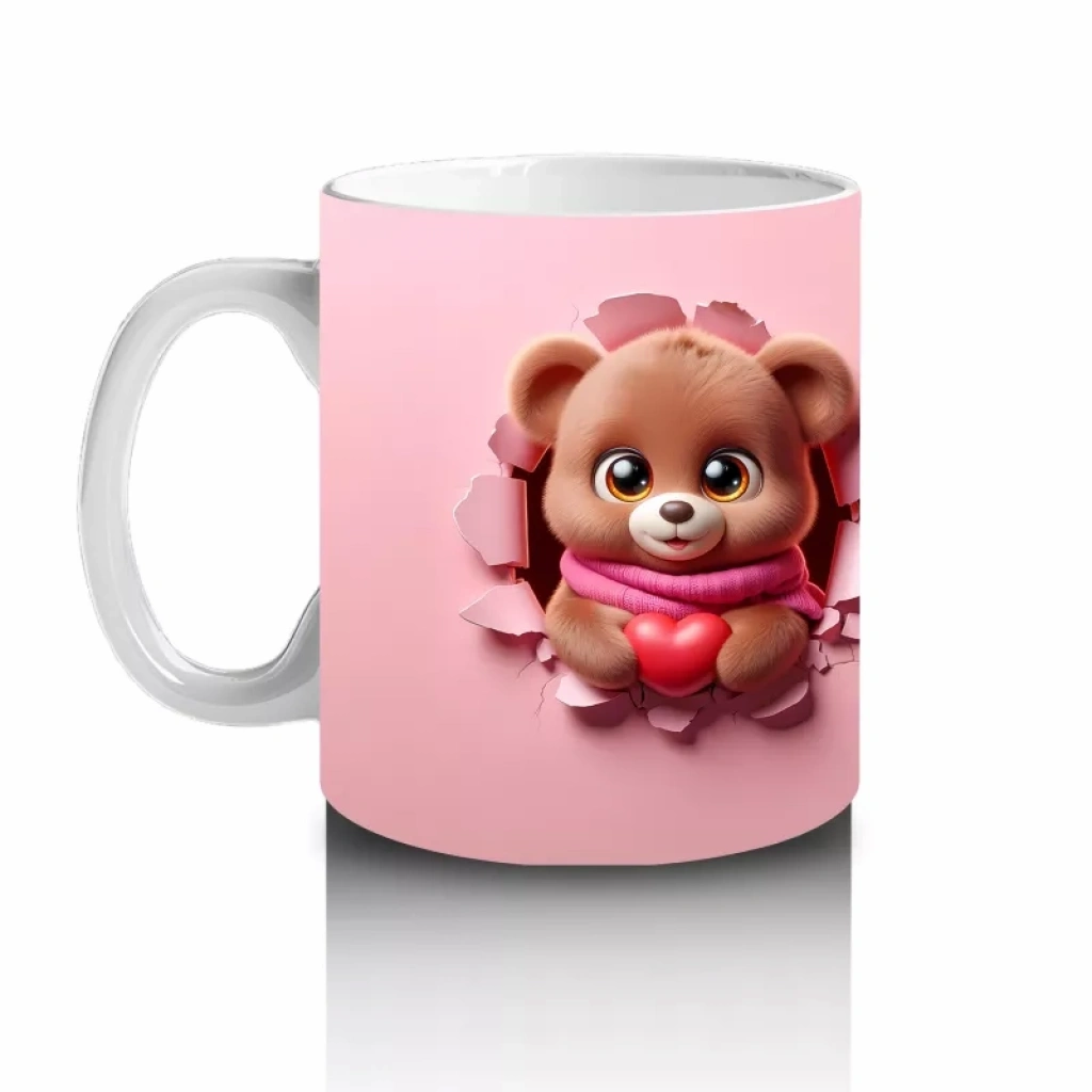 Kalp Tutan Ayıcık Maskot ve Arka Görünümü – Baskılı Kahve Kupası