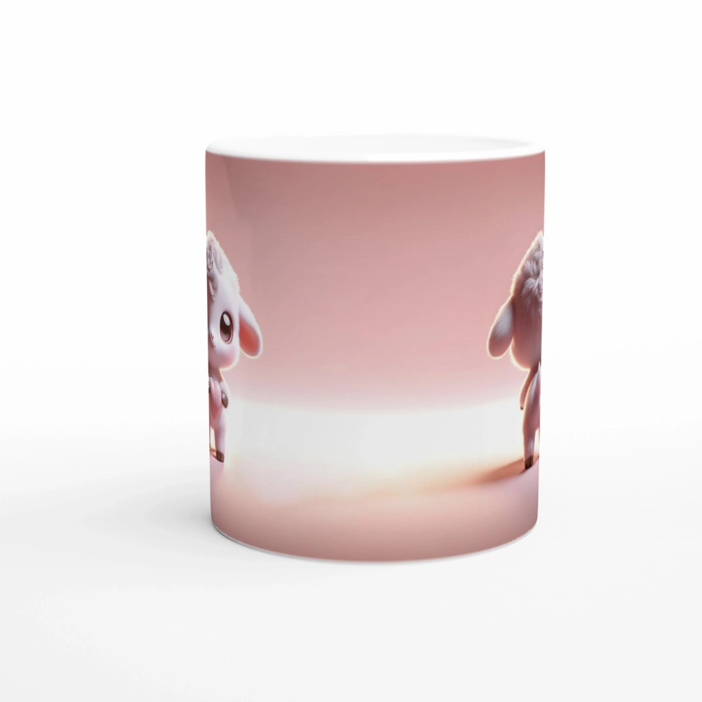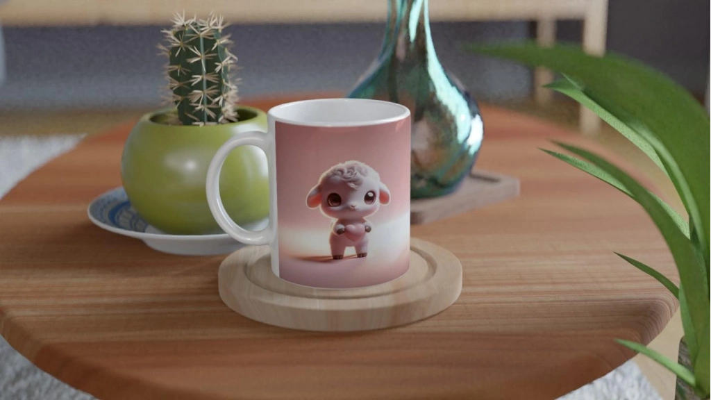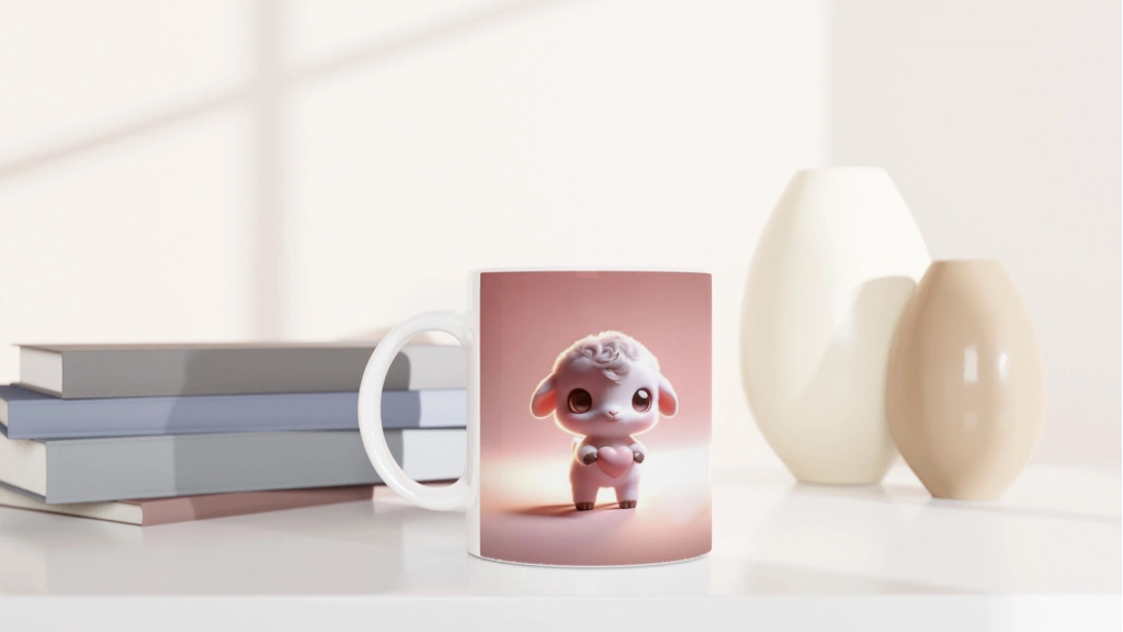 Kalp Tutan Sevimli Kuzu Temalı Baskılı Kupa Bardak, pastel pembe arka planıyla sıcak bir atmosfer sunarken, ön ve arka görünümlü illüstrasyonuyla dikkat çekiyor. Romantik veya duygusal hediye arayanlar için ideal bir seçenek.