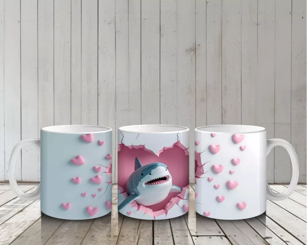 Kalp Yağmuru Altında Gülümseyen Köpek Balığı – Baskılı Kahve Kupası