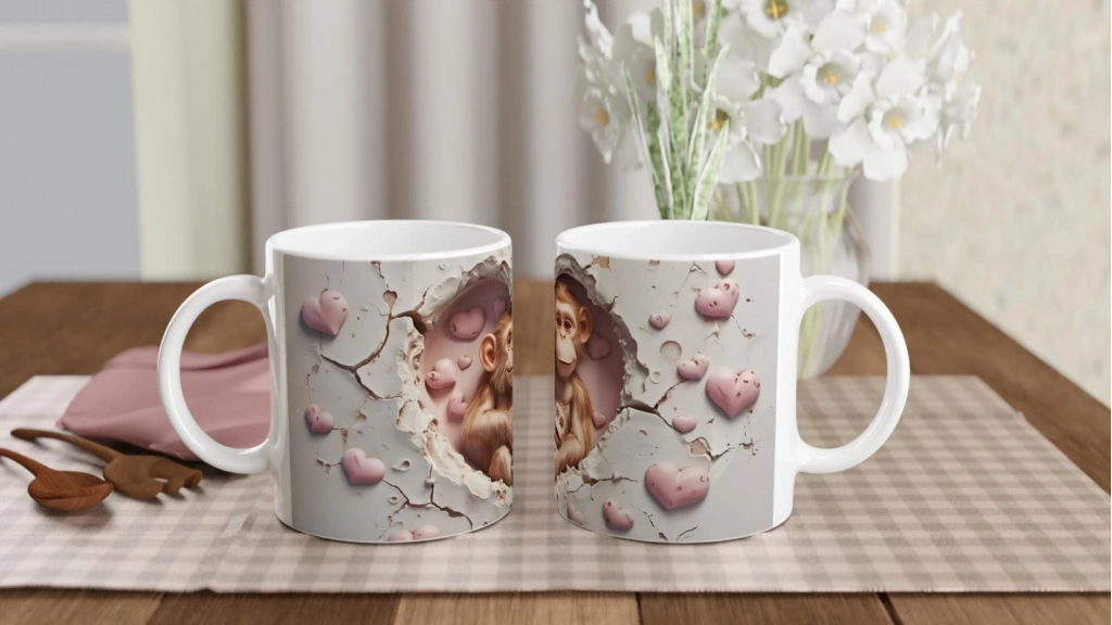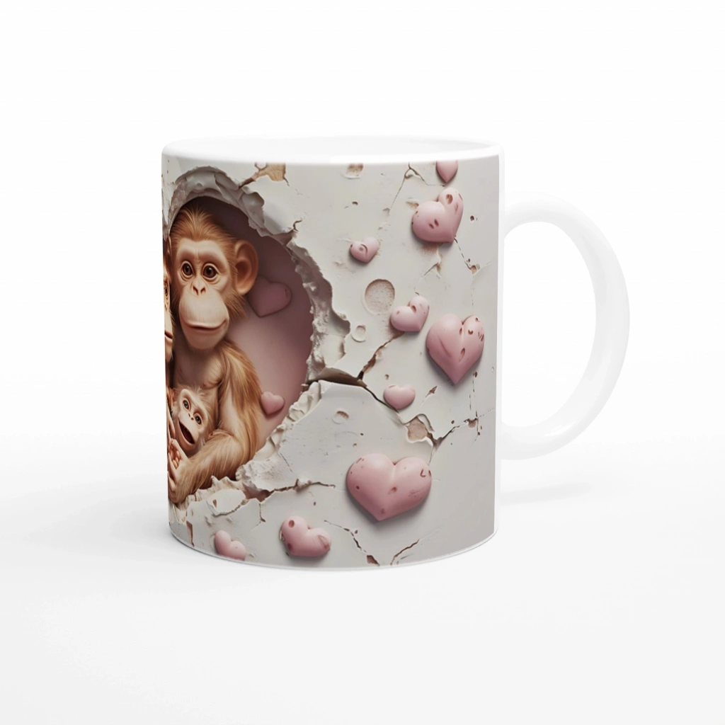 Kırık beyaz duvarda açılmış kalp şeklindeki boşluktan bakan sevimli maymun ailesi, pembemsi kalplerle bezeli arka planla birleşerek sevgi dolu bir sahne oluşturuyor. Özellikle hayvanseverler ve aile temalı hediyelik arayanlar için mükemmel bir tercih.