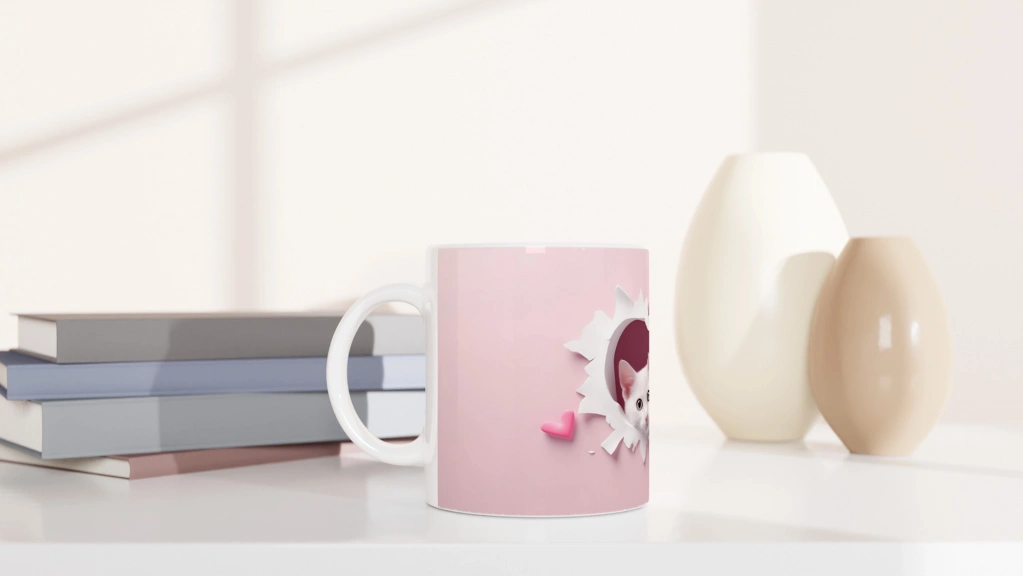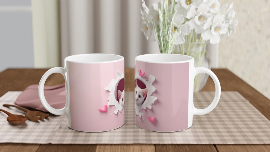 Kalpli Çatlak Duvardan Bakan İki Beyaz Kedi Temalı Baskılı Kupa Bardak, kalp şeklinde açılmış duvar efekti ve etrafa serpilmiş pembe kalplerle romantizmi ve sevimliliği bir arada yansıtıyor. Kedi severler ve özel günlerde anlamlı bir hediye arayanlar için şık bir tercih.