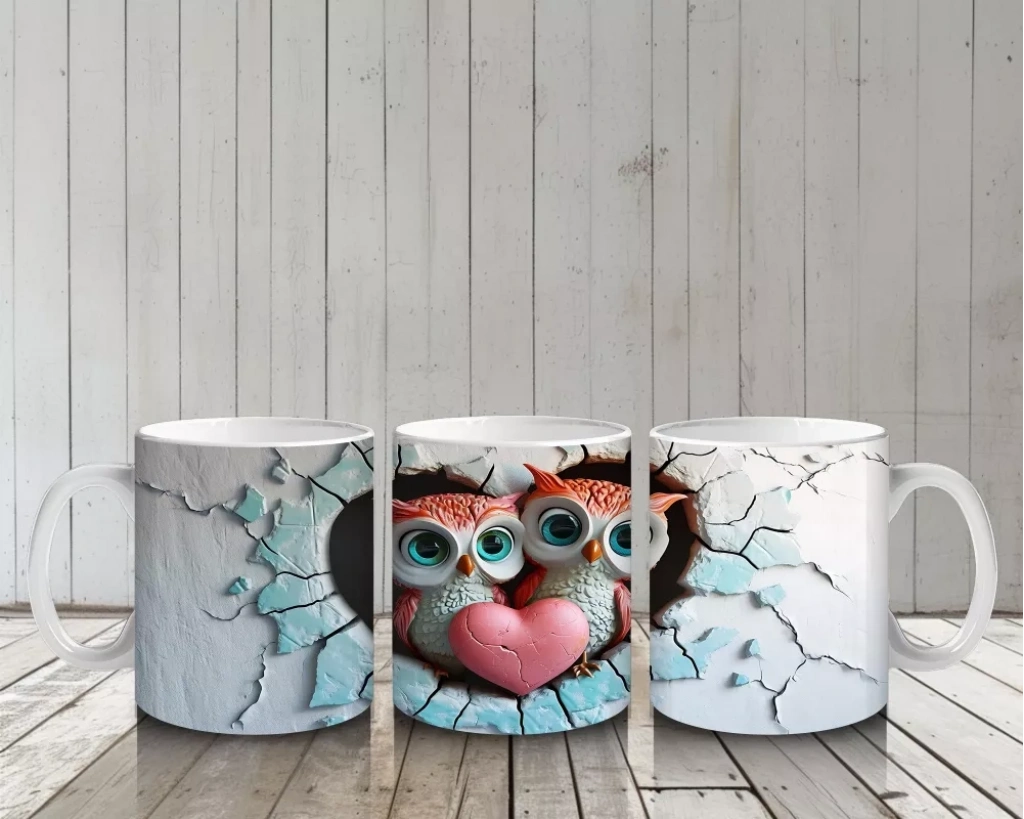 Aşk dolu kalpler ve çatlak duvardan bakan bilge baykuşlar... Bu eşsiz tasarım, hem romantik hem eğlenceli bir kahve keyfi sunuyor. Doğaseverlere özel!