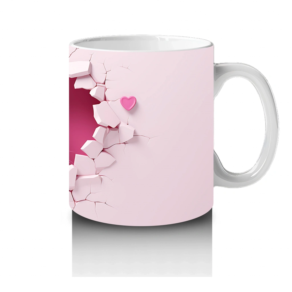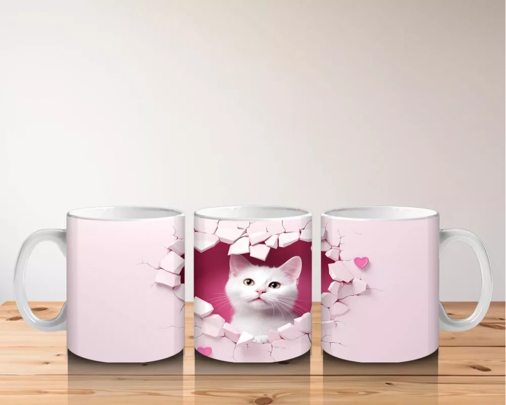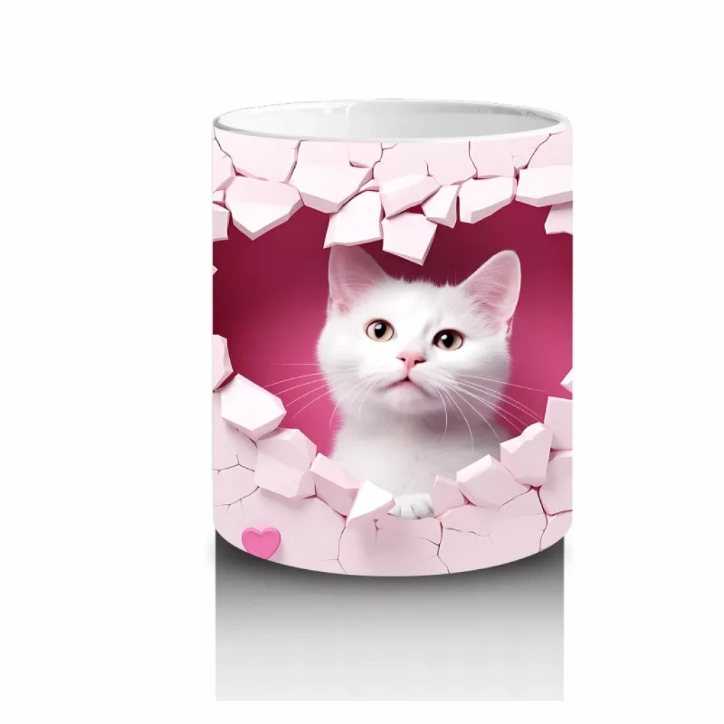 Kalp desenli duvarın arasından sevimli gözlerle bakan beyaz kedi yavrusu, masumiyeti ve sevgiyi yansıtıyor. Romantik ve tatlı bir atmosfer arayanlara özel bir tasarım.
