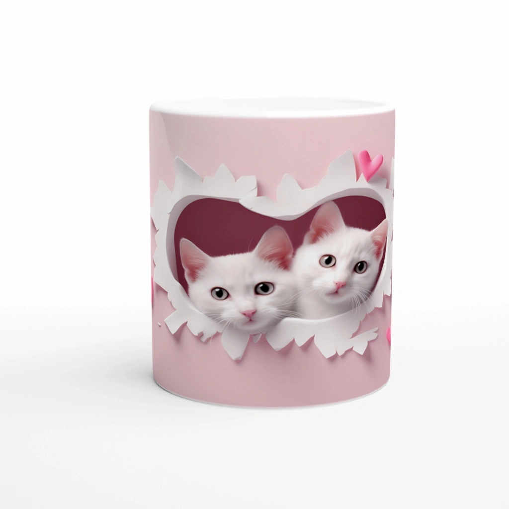 Kalpli Duvardan Bakan İkiz Yavru Kediler Temalı Baskılı Kupa Bardak, pembe arka plan, kalp detayları ve zarif çatlak efektleriyle sevgi dolu bir atmosfer sunar. Kedi severler için özel ve romantik bir hediye alternatifi.