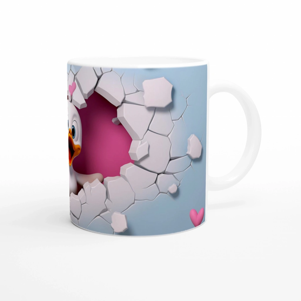 Kalpli Duvarı Delen Sevimli Ördek Temalı Baskılı Kupa Bardak, pembe kalp şeklindeki çatlağın içinden çıkan sevimli ördek karakteriyle dikkat çeker. Eğlenceli ve sevecen tasarımıyla hem çocuklara hem de içindeki çocuğu unutmayanlara hitap eder.