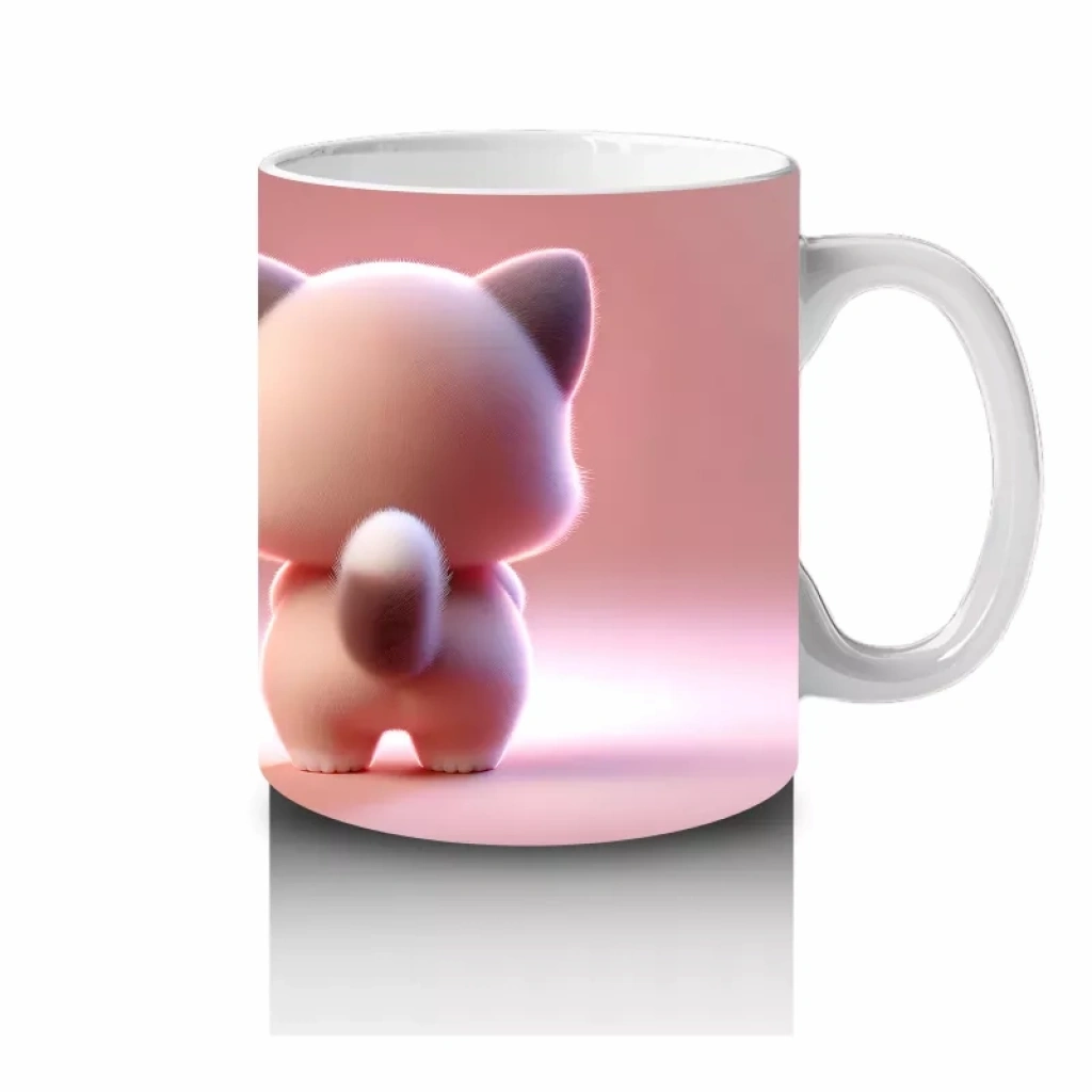 Kalpli Figür Tutan Sevimli Pembe Kedi (Ön ve Arka) – Baskılı Kahve Kupası