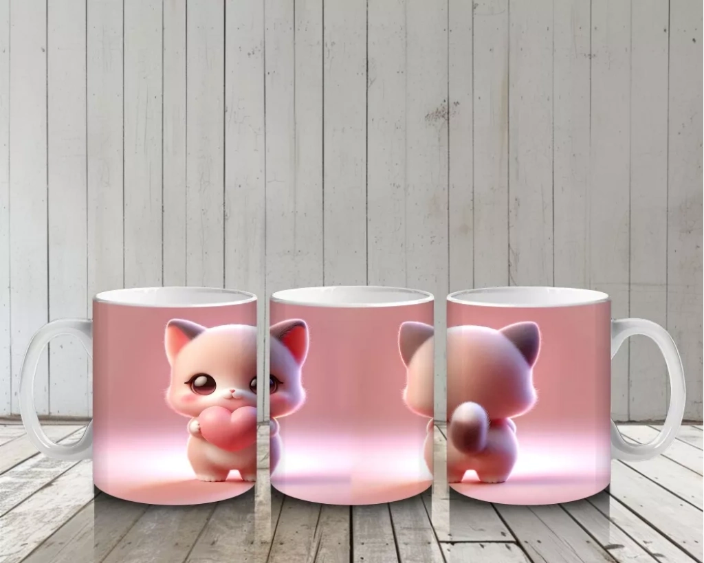 Kalpli figür tutan sevimli pembe kedi, ön ve arka yüzeyde sıcak ve neşeli bir atmosfer yaratıyor. Romantik ve pozitif detayları sevenler için özel bir tasarım.