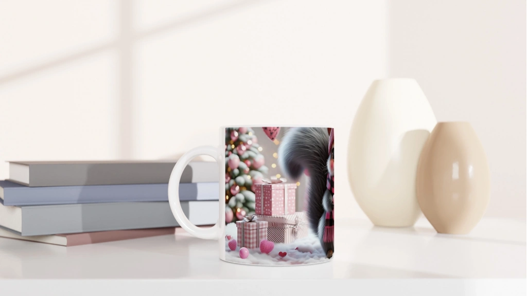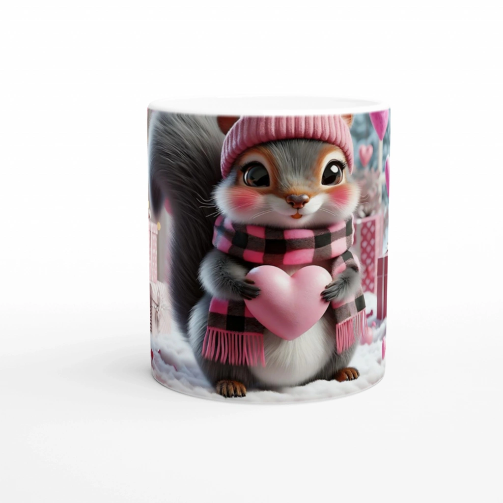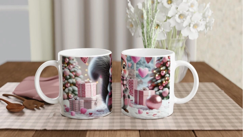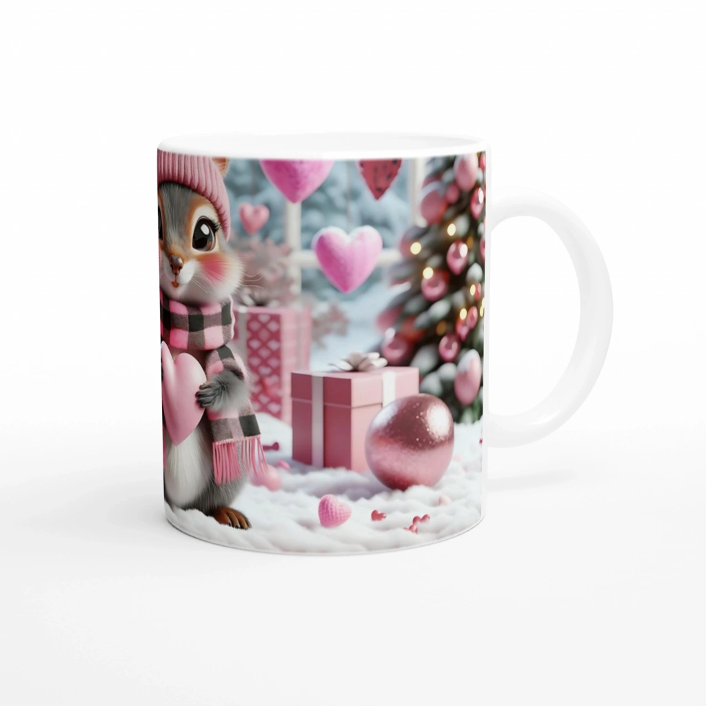 Kalpli Hediye Kutuları Arasında Sevimli Sincap Temalı Baskılı Kupa Bardak, pembe ve beyazın hâkim olduğu kış atmosferi, süslü çam ağaçları ve kalpli dekorlarıyla romantik ve şirin bir hava yaratıyor. Özellikle özel günlerde sevgiyle verilecek anlamlı bir hediye alternatifi.