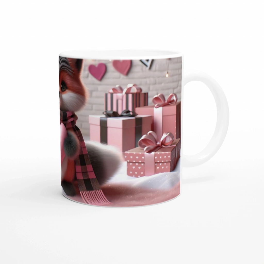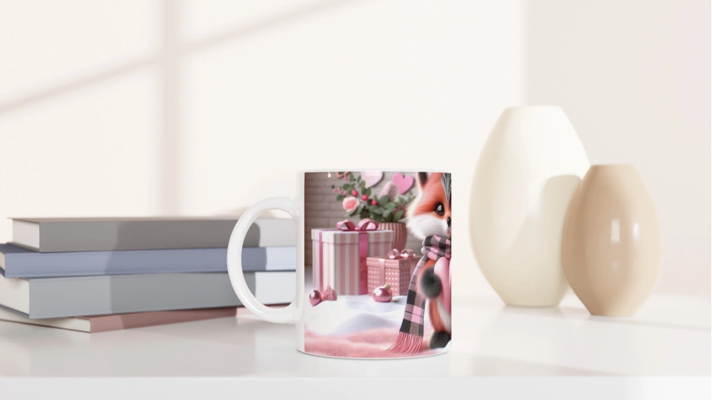 Kalpli Hediye Tutan Sevimli Tilki Temalı Baskılı Kupa Bardak, pembe tonlardaki hediye kutuları ve yumuşak atmosferiyle romantik bir dünyaya davet ediyor. Aşkın ve sevecenliğin sembolü olan bu kupa, özel günler için mükemmel bir armağan.
