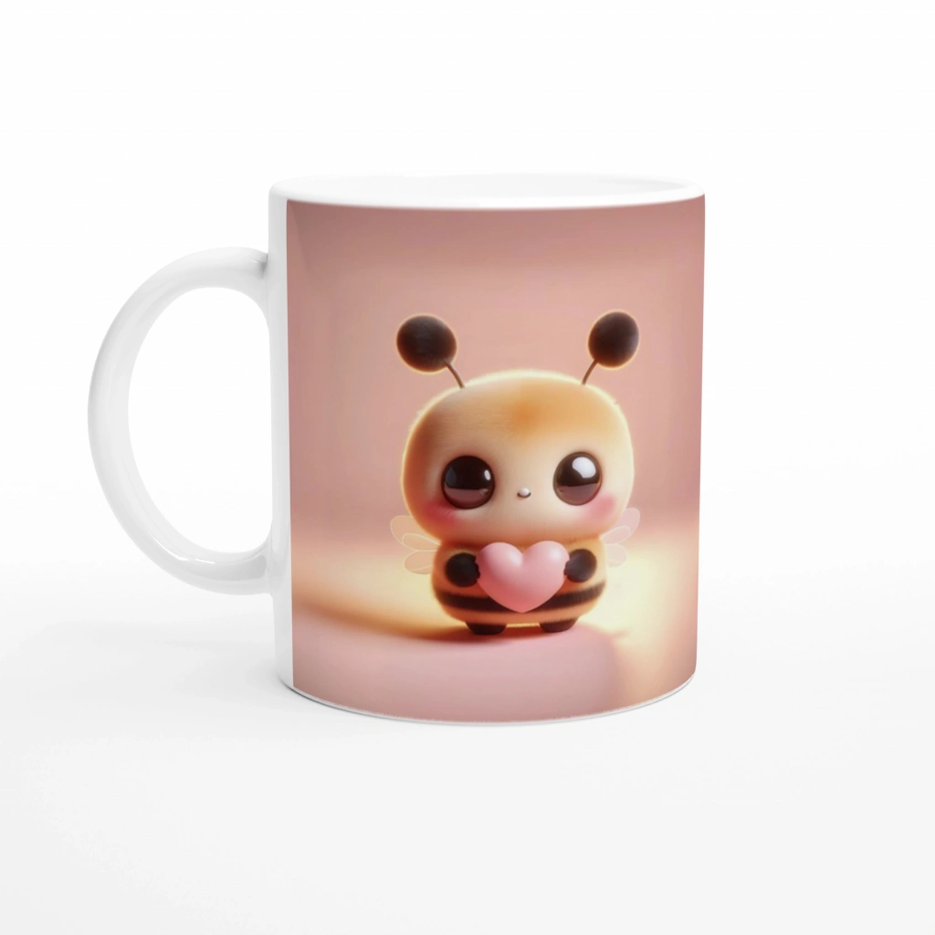 Kalpli Mini Sevimli Arı Temalı Baskılı Kupa Bardak, pastel pembe fonda tatlı bir enerji yayan bu minik arıcıkla kahve keyfinizi daha neşeli hale getiriyor. Arının hem önden hem arkadan görünen çift yönlü tasarımıyla farklı bir deneyim!