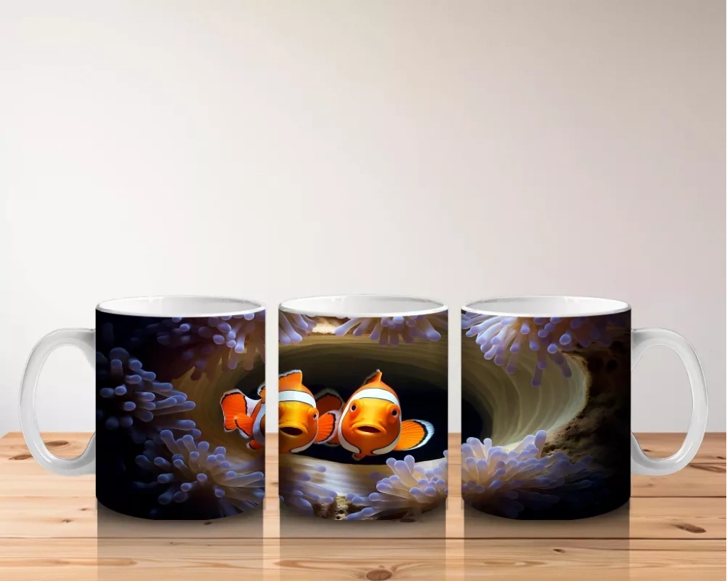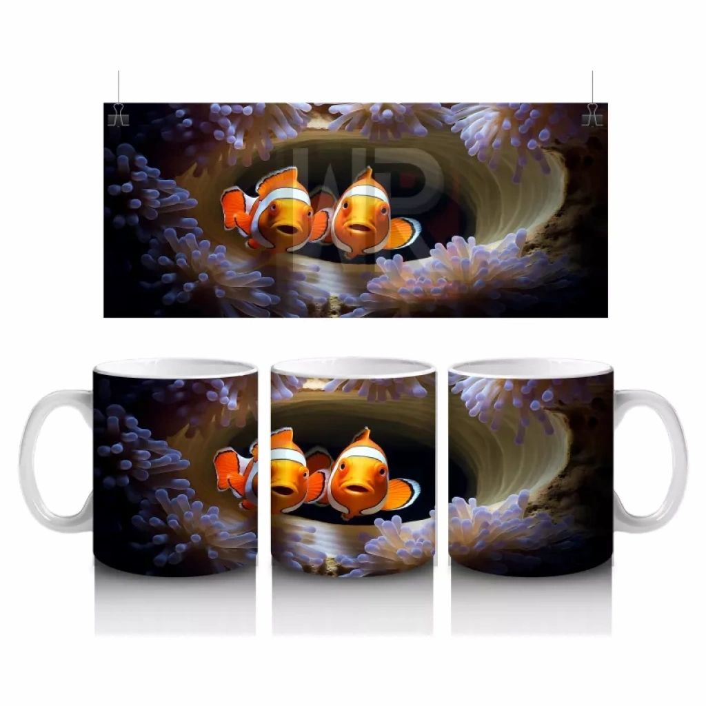Karanlık fon üzerinde parlayan palyaço balığı, canlı renkler ve gizemli bir atmosfer sunuyor. Canlı ve özgün tasarımlar arayanlara ideal bir kupa.