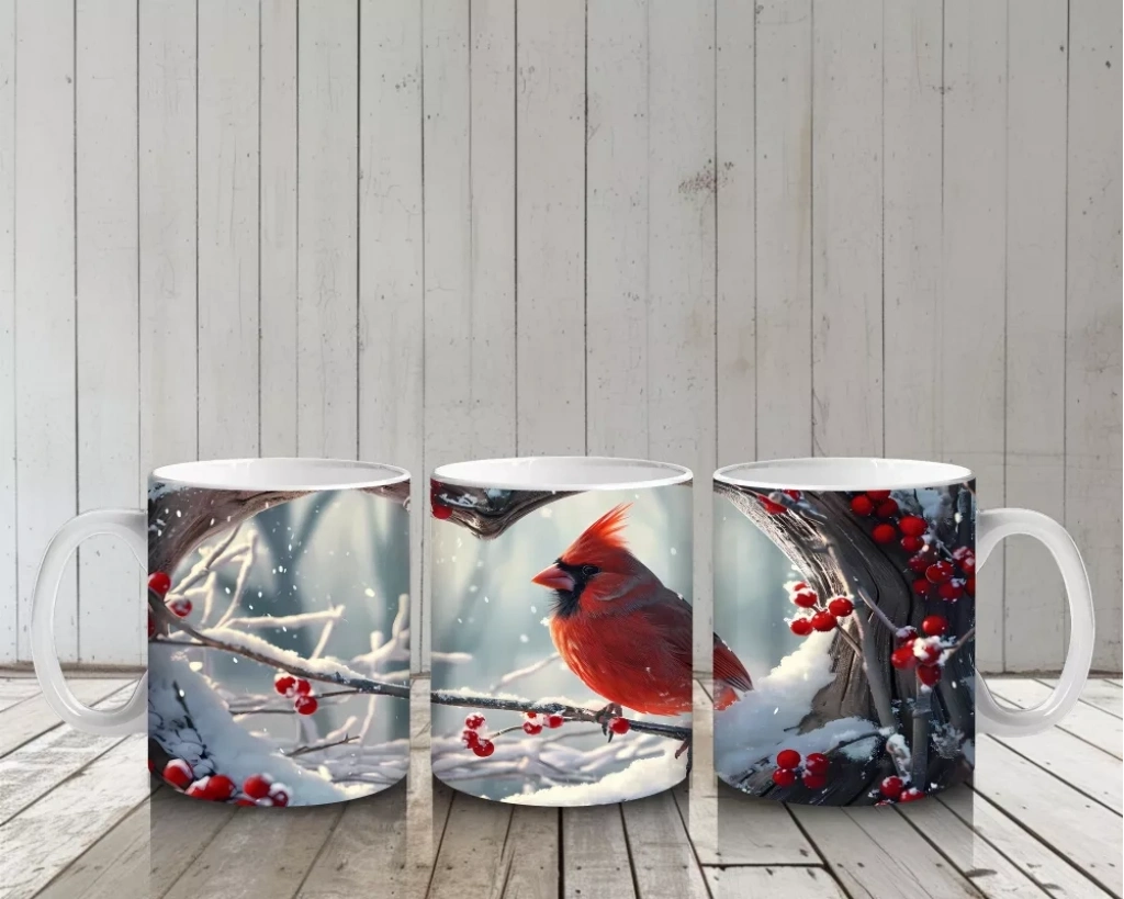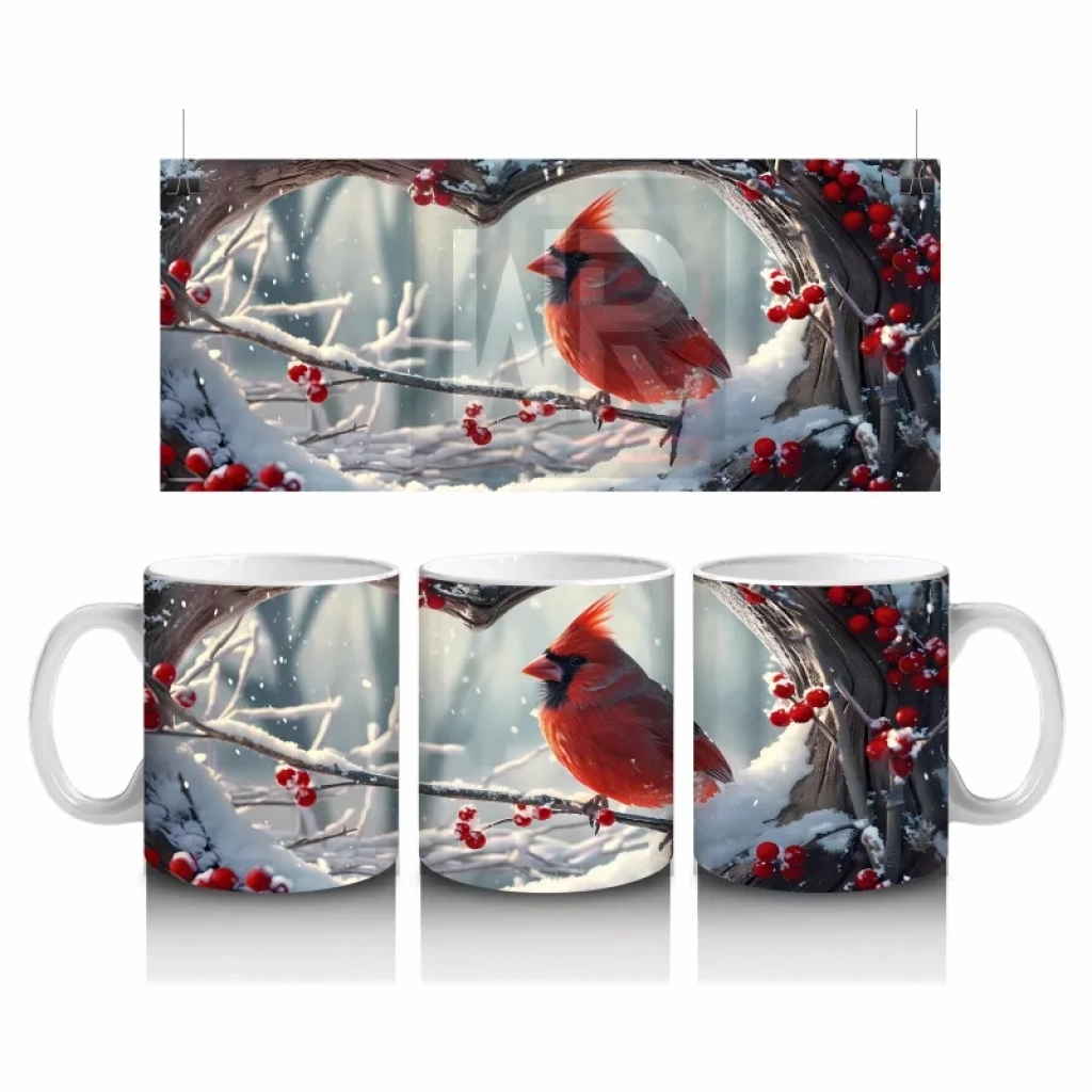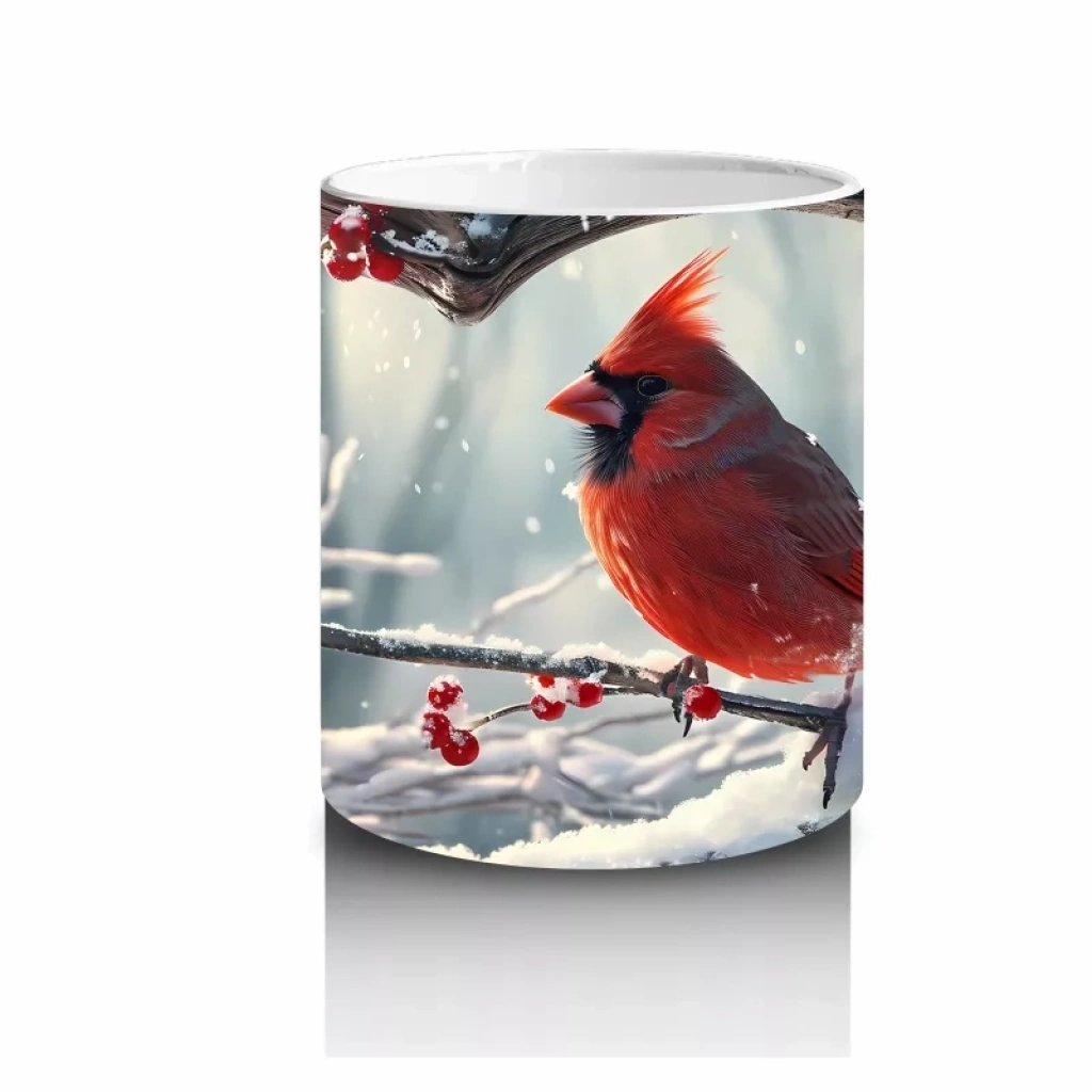 Karla kaplı dallarda duran kırmızı kardinal, zarif ve dikkat çekici bir görünüm sunuyor. Kışın büyüsünü ve doğallığını sevenler için ideal bir tasarım.