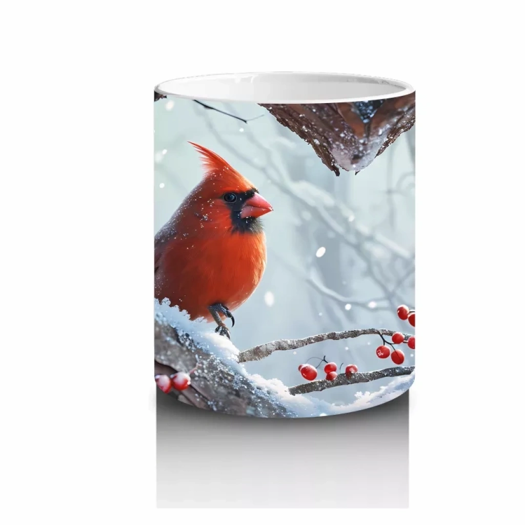 Karla örtülmüş dallar arasında parlayan kırmızı kardinal, kışın sessiz güzelliğini ve zarafetini yansıtıyor. Doğal ve mevsimsel tasarımları sevenler için huzurlu bir kupa seçeneği.