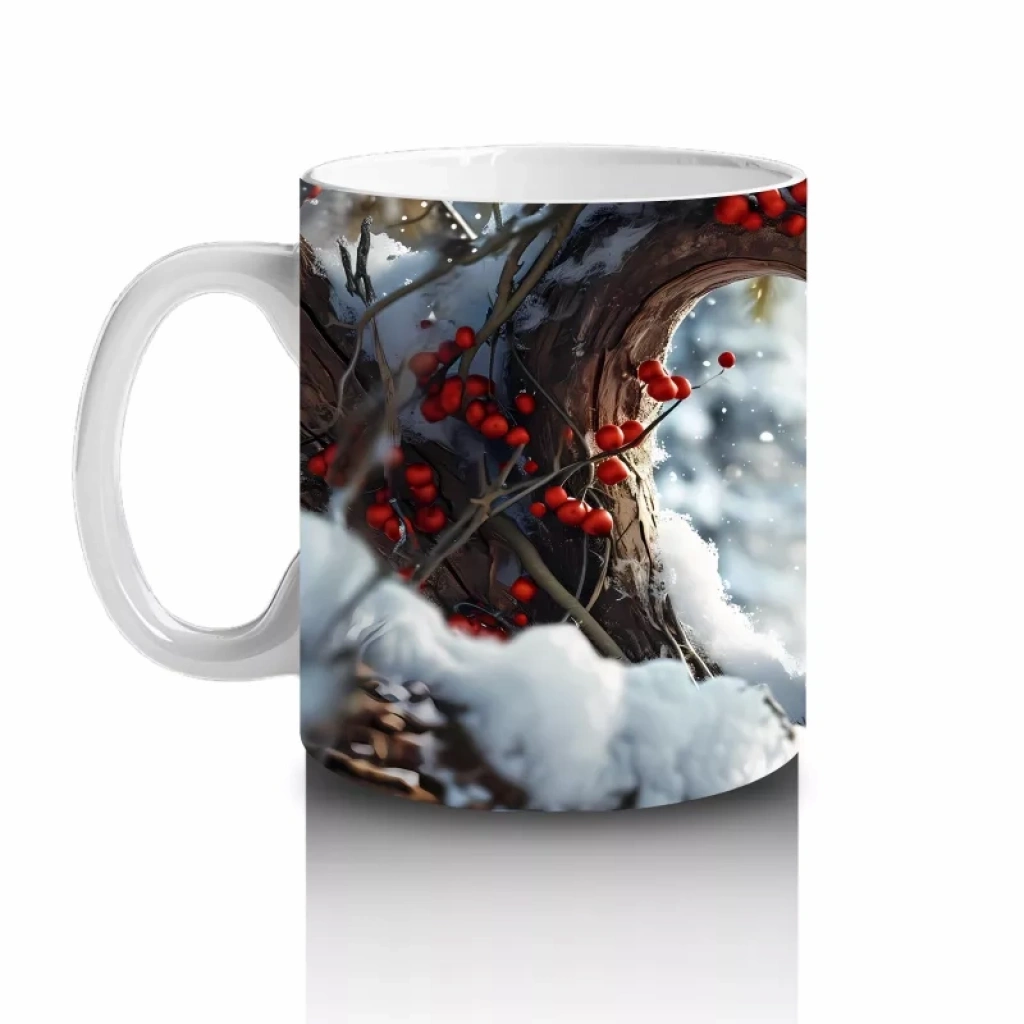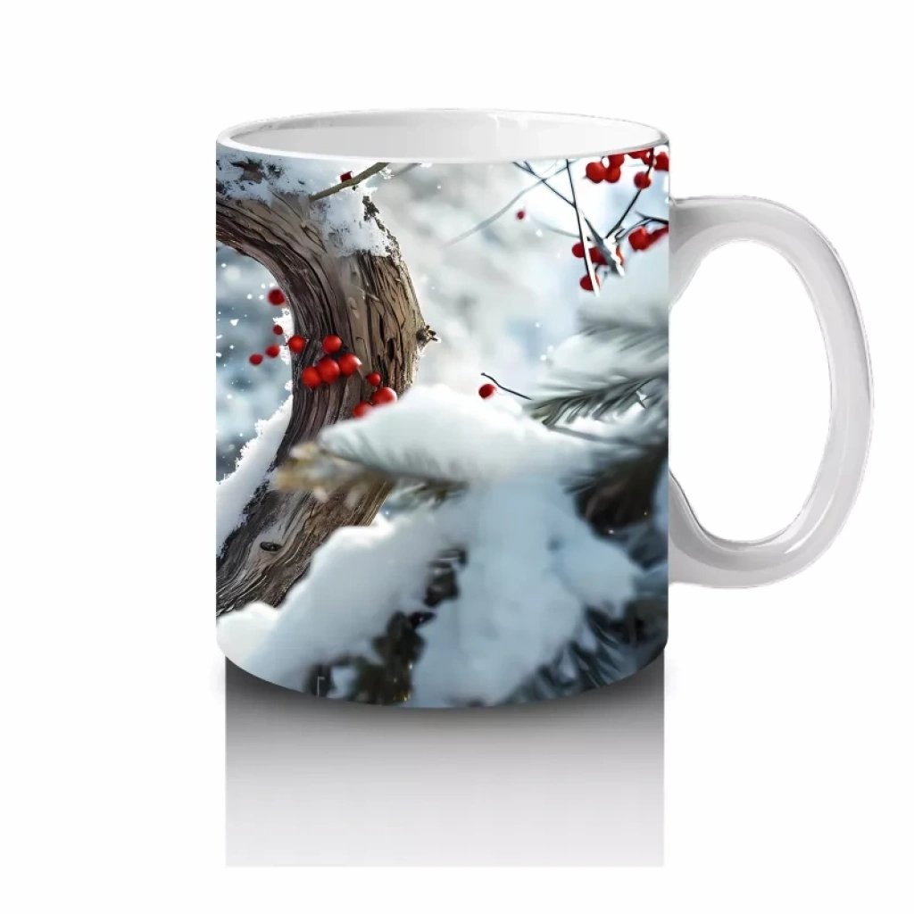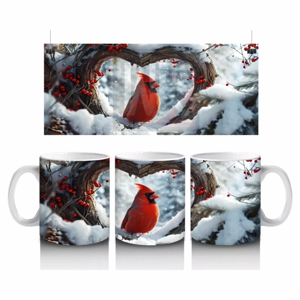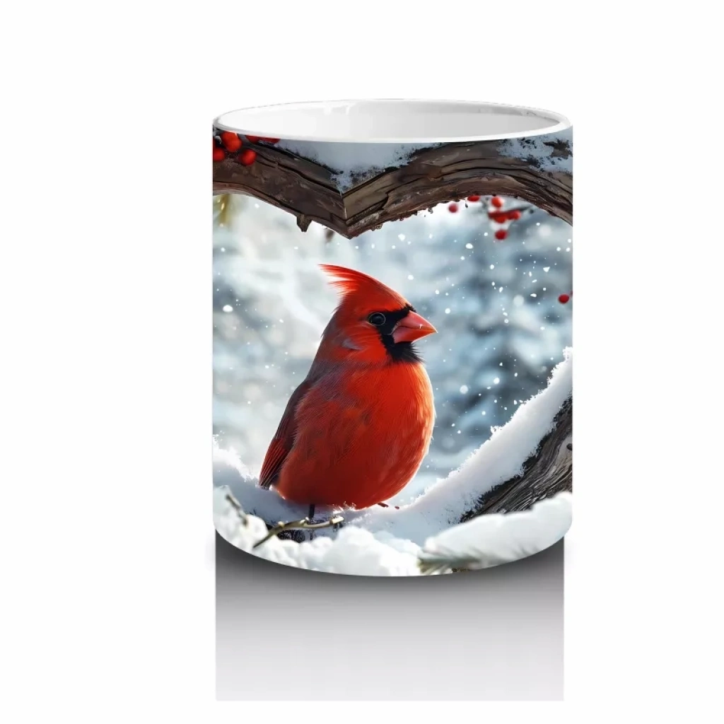 Kışın beyazlığına kontrast oluşturan kırmızı kardinal, karla kaplı dallar arasında duruşuyla görsel bir zarafet sunuyor. Mevsim temalı, sakin ve estetik bir kupa tasarımı arayanlara özel.