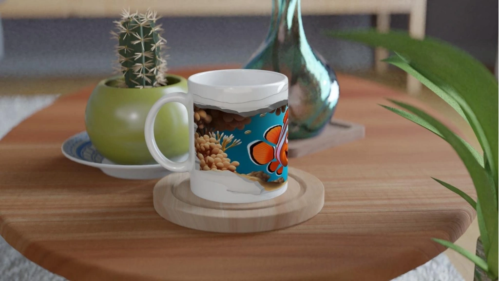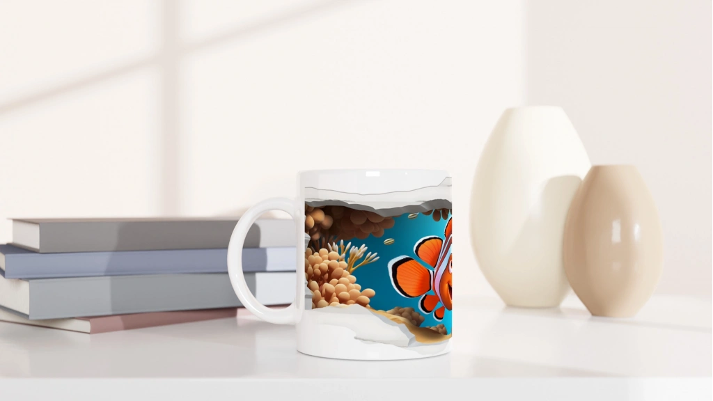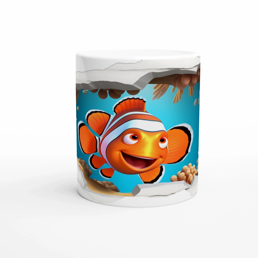 Kırık Duvarın Ardında Gülümseyen Palyaço Balığı Baskılı Kupa Bardak, deniz yaşamının canlı renkleriyle tasarlanmış dinamik bir sahne sunuyor. Duvarı aşan balık figürü sayesinde palyaço balığı baskılı kupa, çocuklara ve deniz severlere özel eğlenceli bir tercih haline geliyor.
