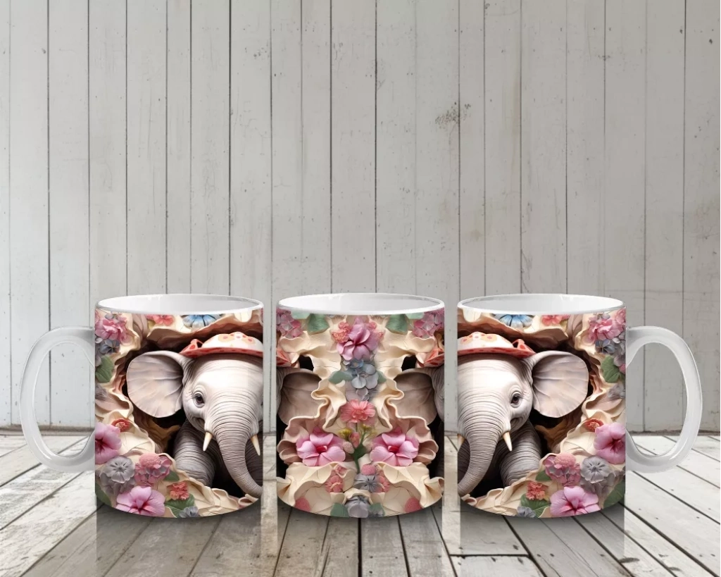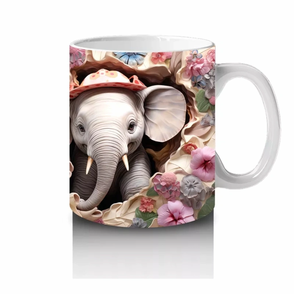 Kırmızı Şapkalı Filler Arasında Çiçekler – Baskılı Kahve Kupası