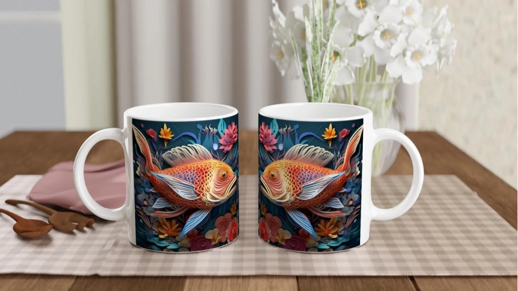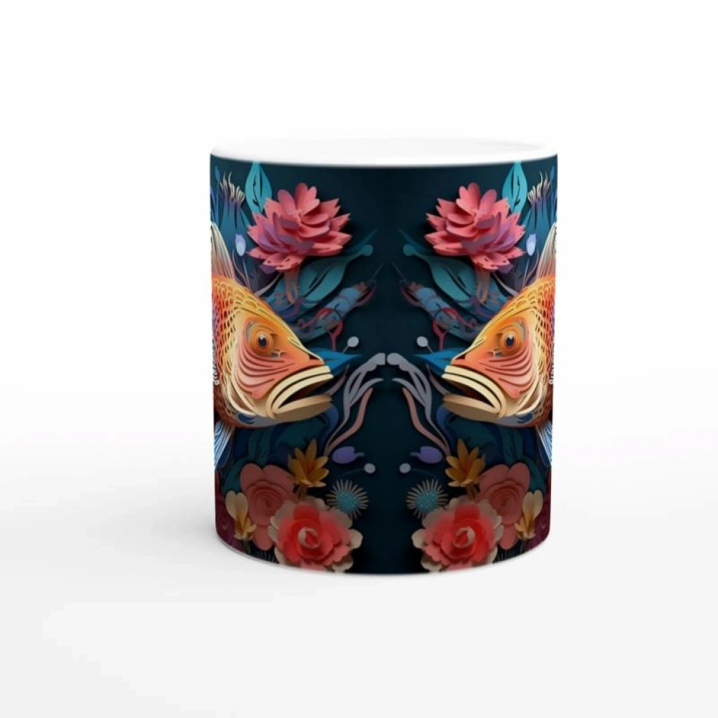 Japon kültüründe şans ve sabrı simgeleyen koi balığı, bu göz alıcı kupa bardakta çiçeklerle dans ediyor.