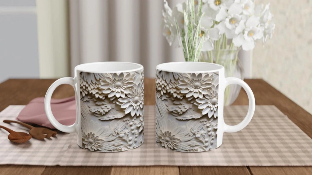 Katmanlı rölyef çiçek dokusu ve yumuşak tonlarıyla bu kupa bardak, huzurlu bir içim deneyimi yaratır.