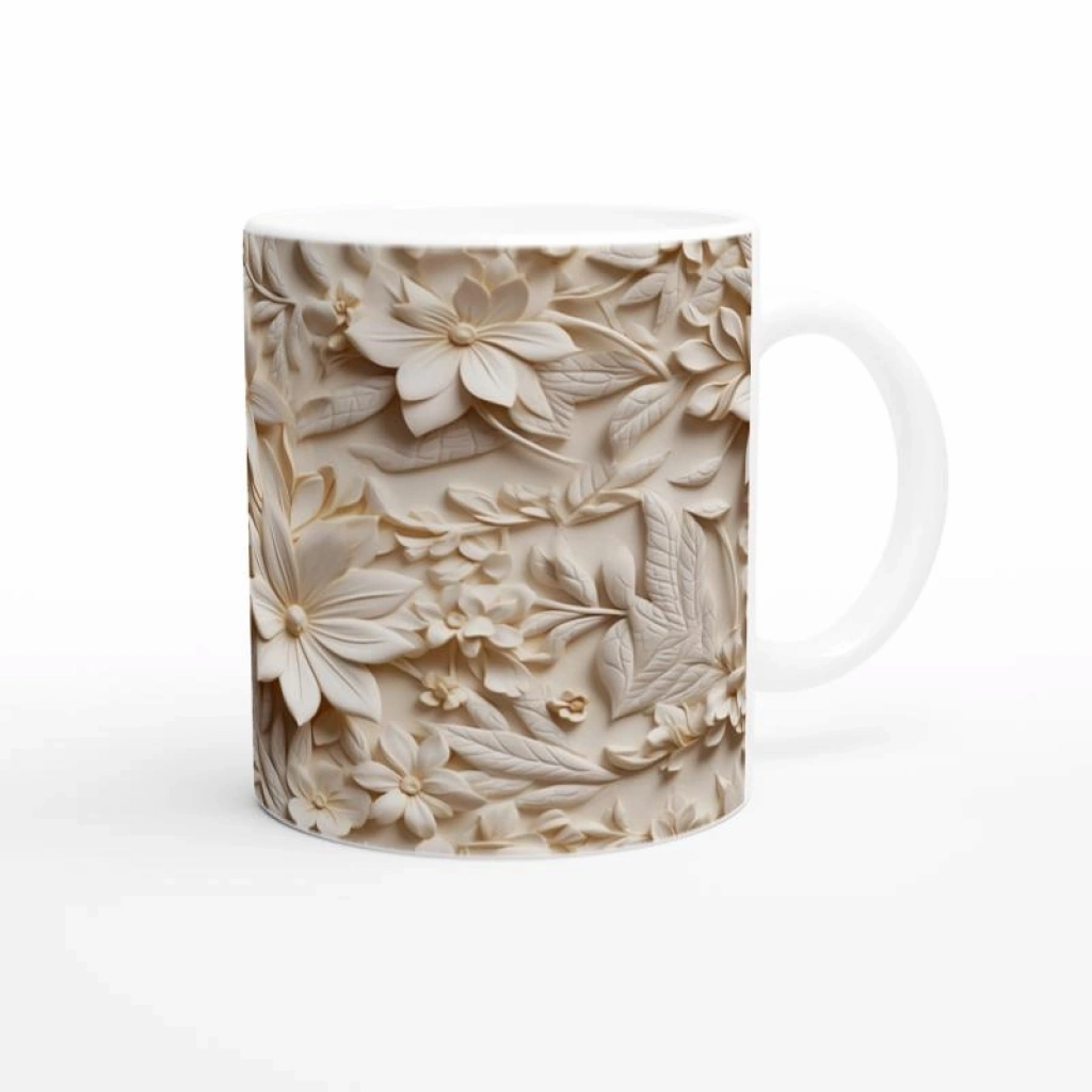 Krem Rölyef Doku Çiçek Desenli Kupa Bardak