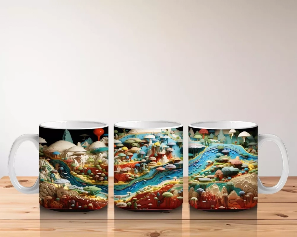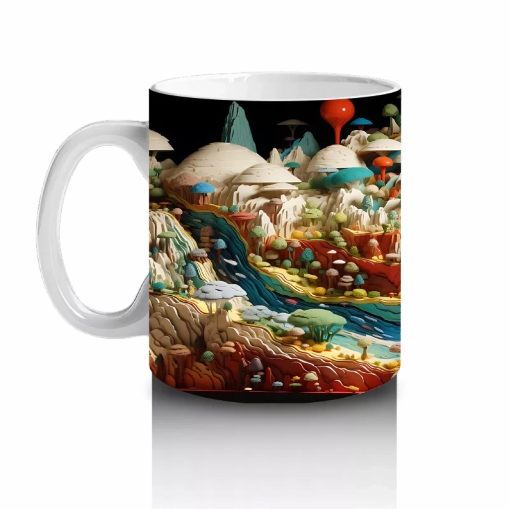 Mantar evler ve nehir manzarasıyla süslenmiş bu masalsı dünya tasarımı, hayal gücünü harekete geçiriyor. Masalsı ve fantastik detayları sevenlere özel sıcak bir kupa.