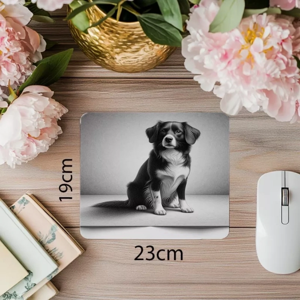 Mat dokulu karakalem köpek tasarımlı mouse pad, yüksek hassasiyetli yüzeyi ve kaymaz alt zemin ile uzun ömürlü ve şık bir deneyim sağlar.