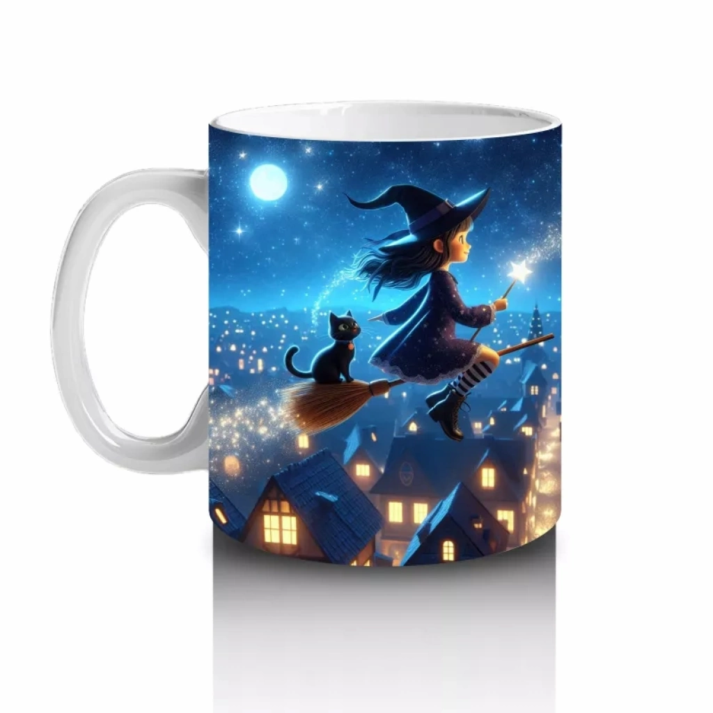 Mavi Arka Plan Üzerinde Uçan Cadı Silüetleriyle Renkli Cadılar Bayramı Baskılı KupaMavi arka plan üzerinde uçan cadı silüetleriyle tasarlanan bu renkli kupa bardak, Cadılar Bayramı’na enerjik ve büyülü bir hava katar.