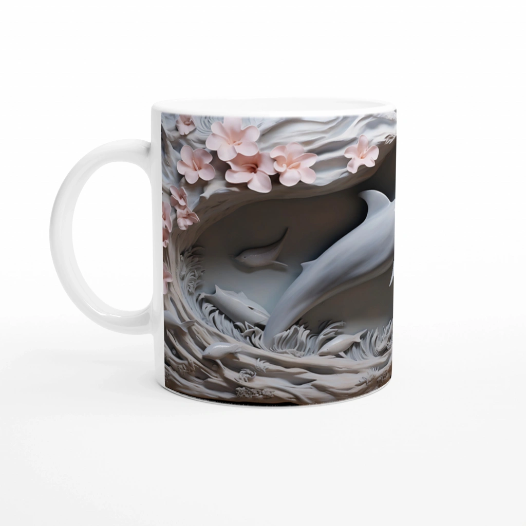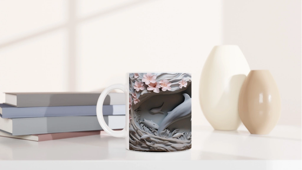 Sanatsal detaylarla zenginleşen bu yunus desenli kupa bardak, doğanın zarafetini ve okyanusun büyüsünü bir arada sunuyor.