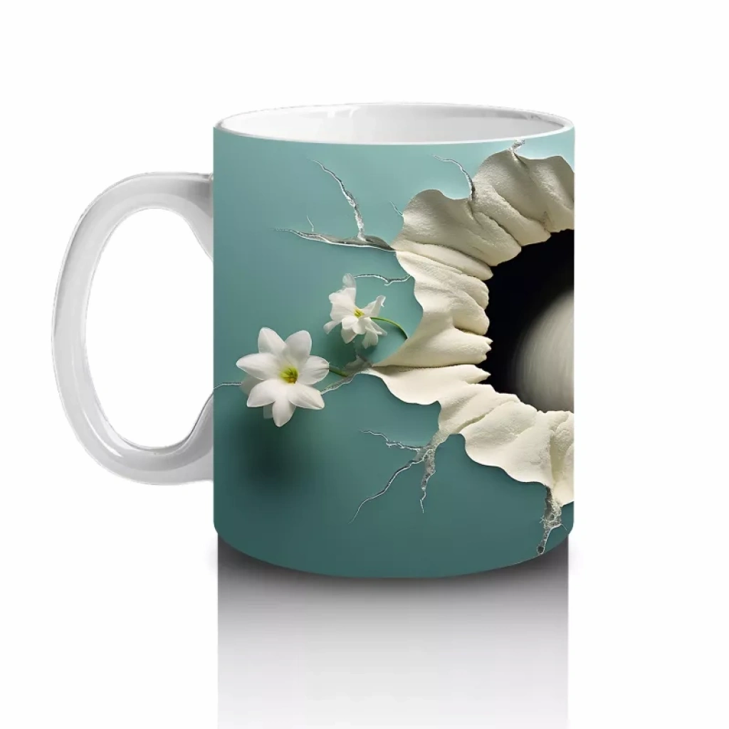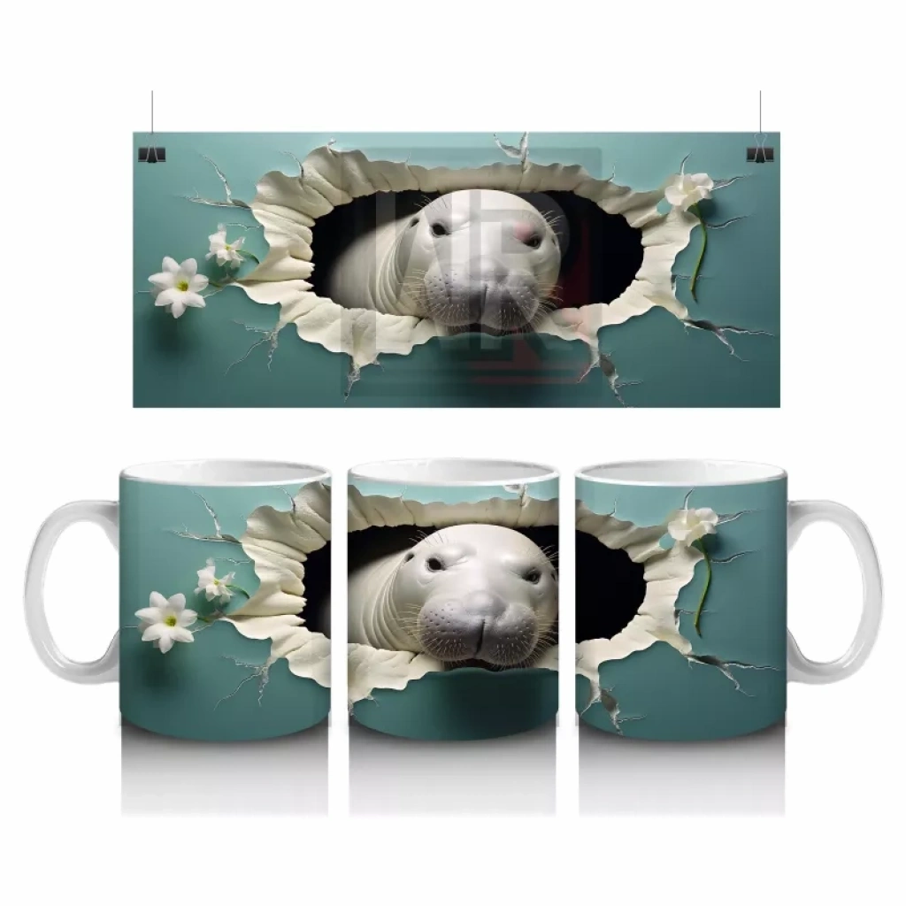 Papatya çiçeğiyle çevrili çatlak duvar arasında duran deniz ineği, zarif ve doğal bir görüntü sunuyor. Deniz canlılarını sevenler için huzurlu ve estetik bir kupa tasarımı.