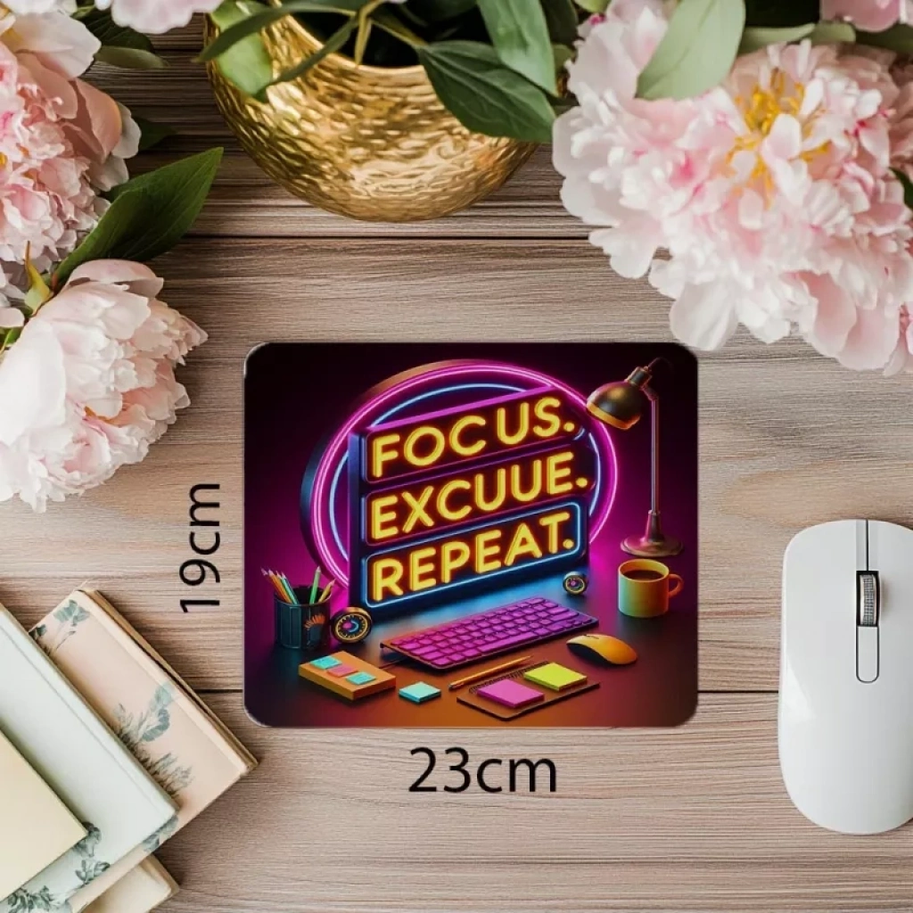 Parlak desenli ofis mousepad ile masanıza canlılık ve odaklanma getirin. “Focus Repeat” sloganı, her tıklamada motivasyonunuzu yükseltir.