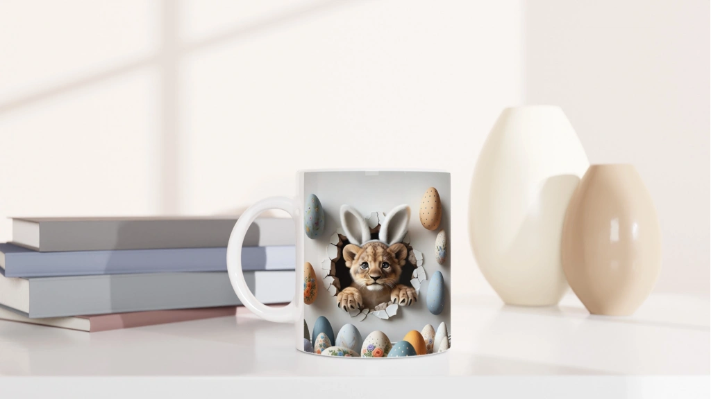 Paskalya Yumurtaları Arasında Tavşan Kulaklı Aslan Yavrusu Temalı Baskılı Kupa Bardak, hem yırtıcı bir masumiyeti hem de neşeli detaylarıyla dikkat çekiyor. Renkli yumurtalar ve kırık duvar efektiyle öne çıkan bu tasarım, bayram ruhunu yansıtan özgün bir hediye alternatifi sunuyor.