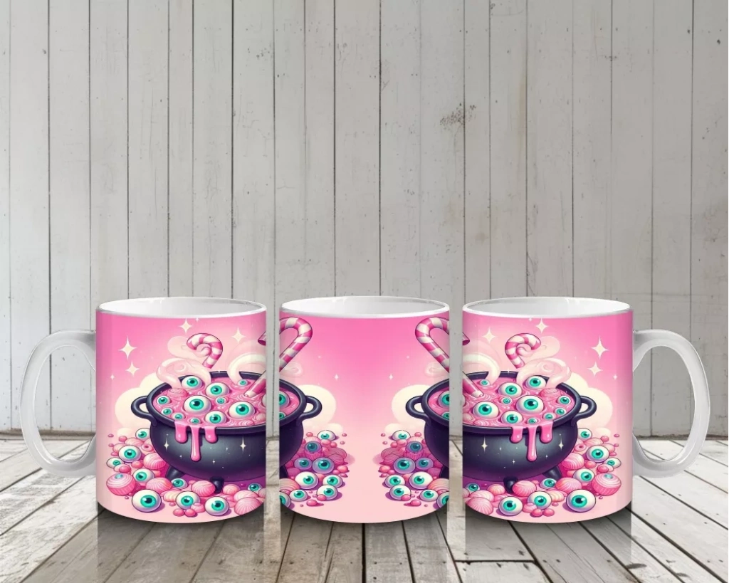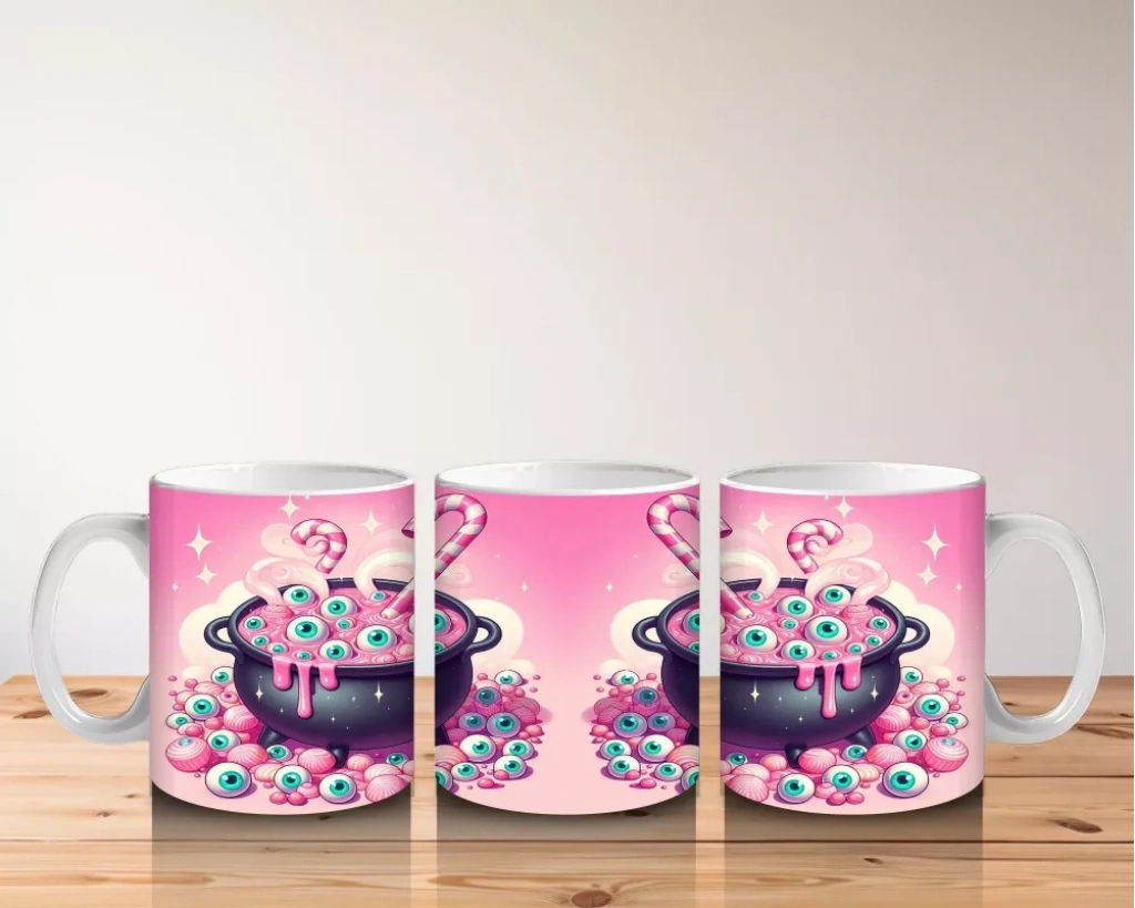 Pembe Arka Plan Üzerinde Şeker Dolu Cadı Kazanı Figürlü Cadılar Bayramı Baskılı Kupa BardakPembe arka plan üzerinde şeker dolu cadı kazanı figürüyle hazırlanan bu kupa bardak, Cadılar Bayramı’na tatlı ve renkli bir dokunuş yapar.