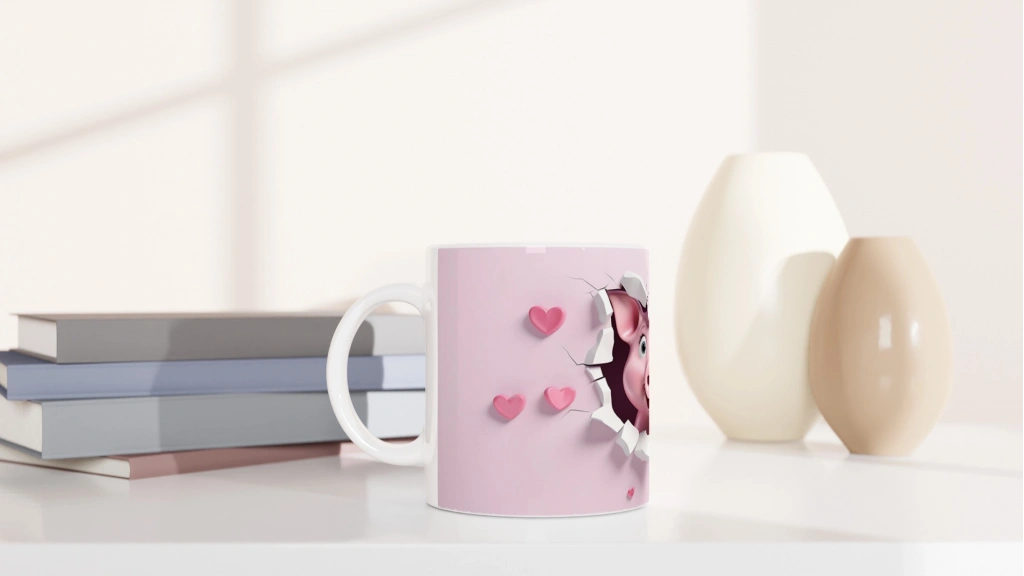 Pembe Çatlaktan Bakan Tatlı Domuz Temalı Baskılı Kupa Bardak, kalp süslemeli arka planı ve beyaz çatlak efektli duvar detayıyla eğlenceli bir görsellik sunar. Pozitif enerji arayanlar için mükemmel bir tercih.