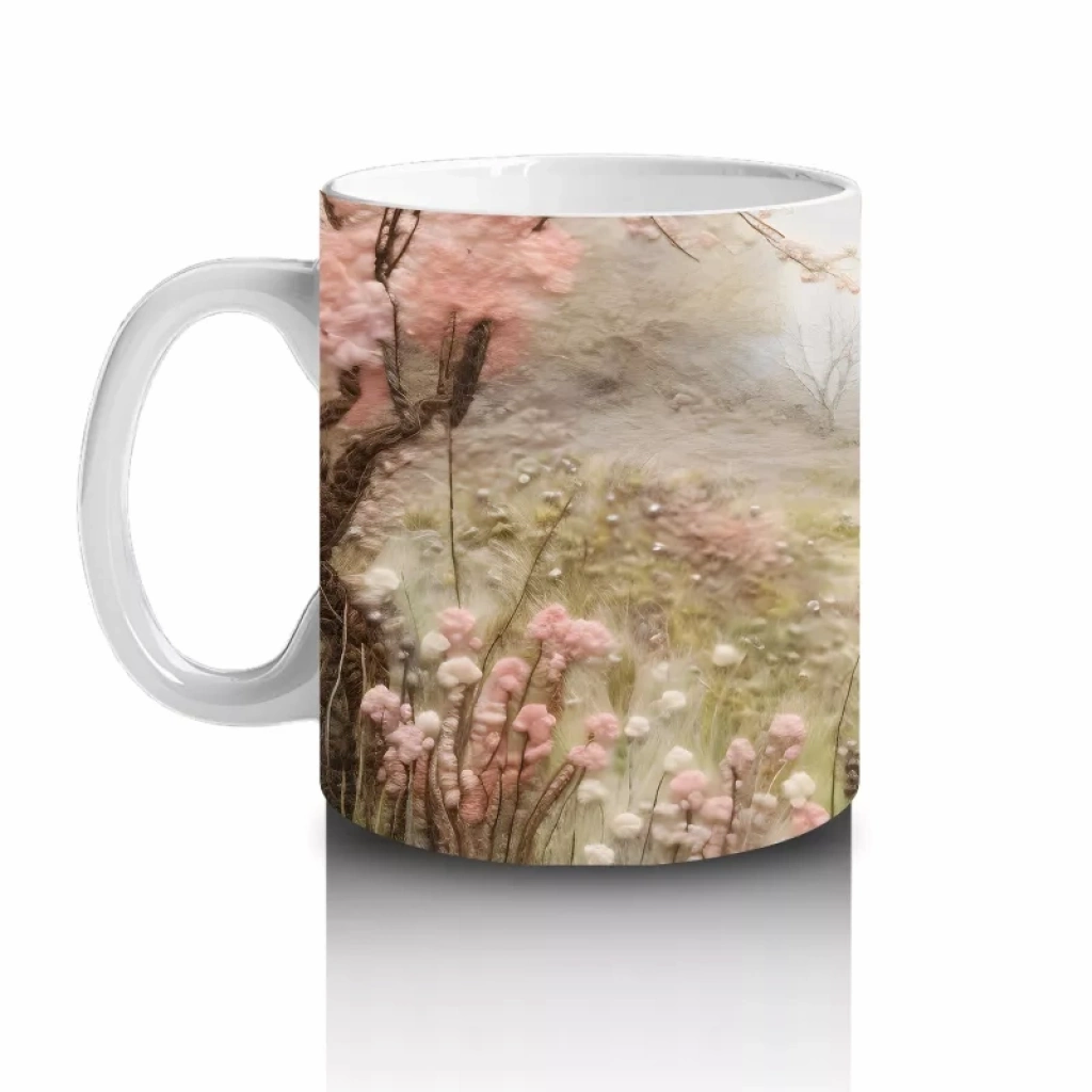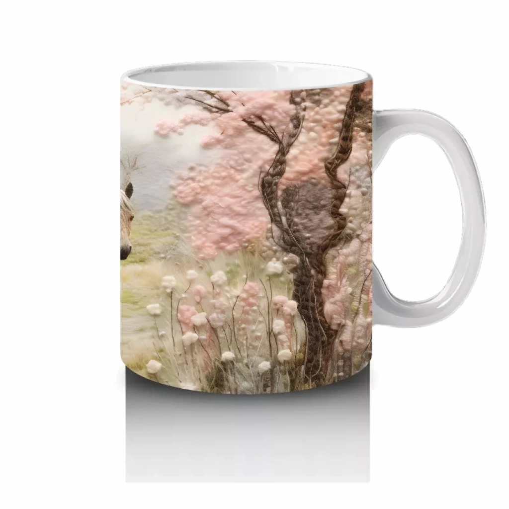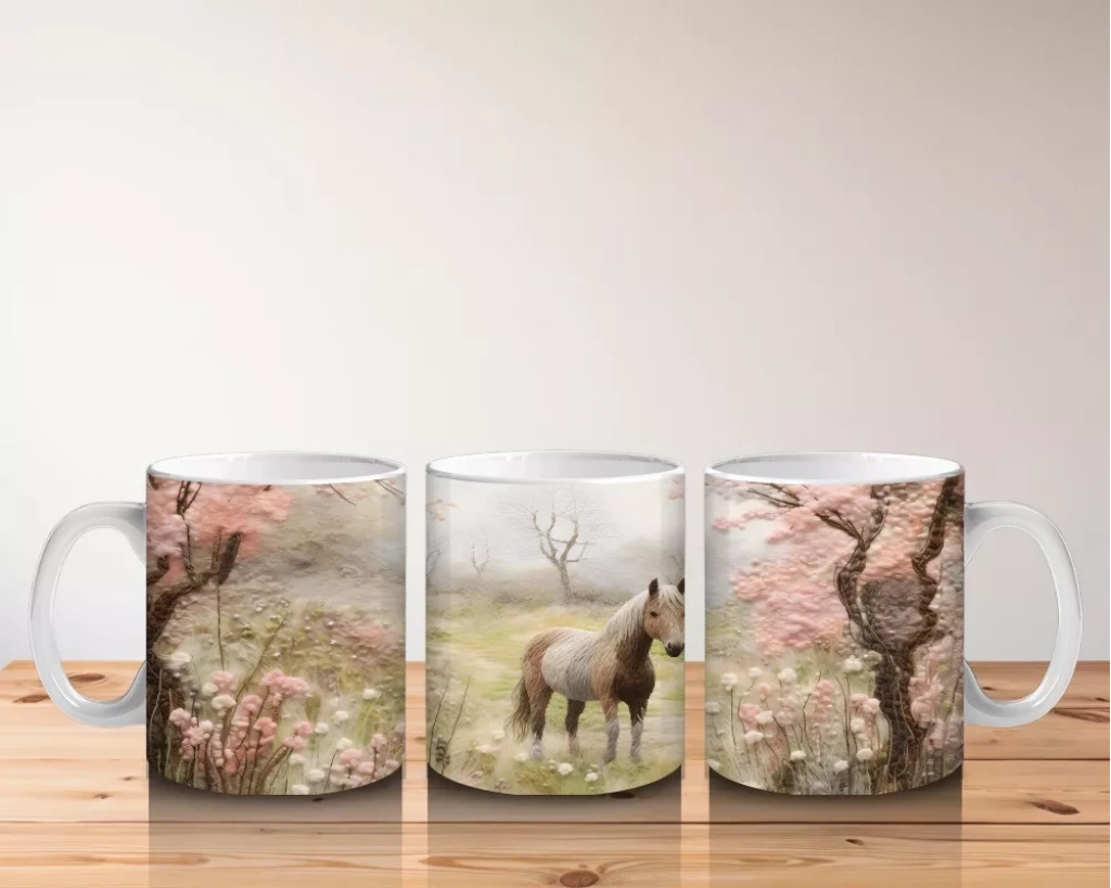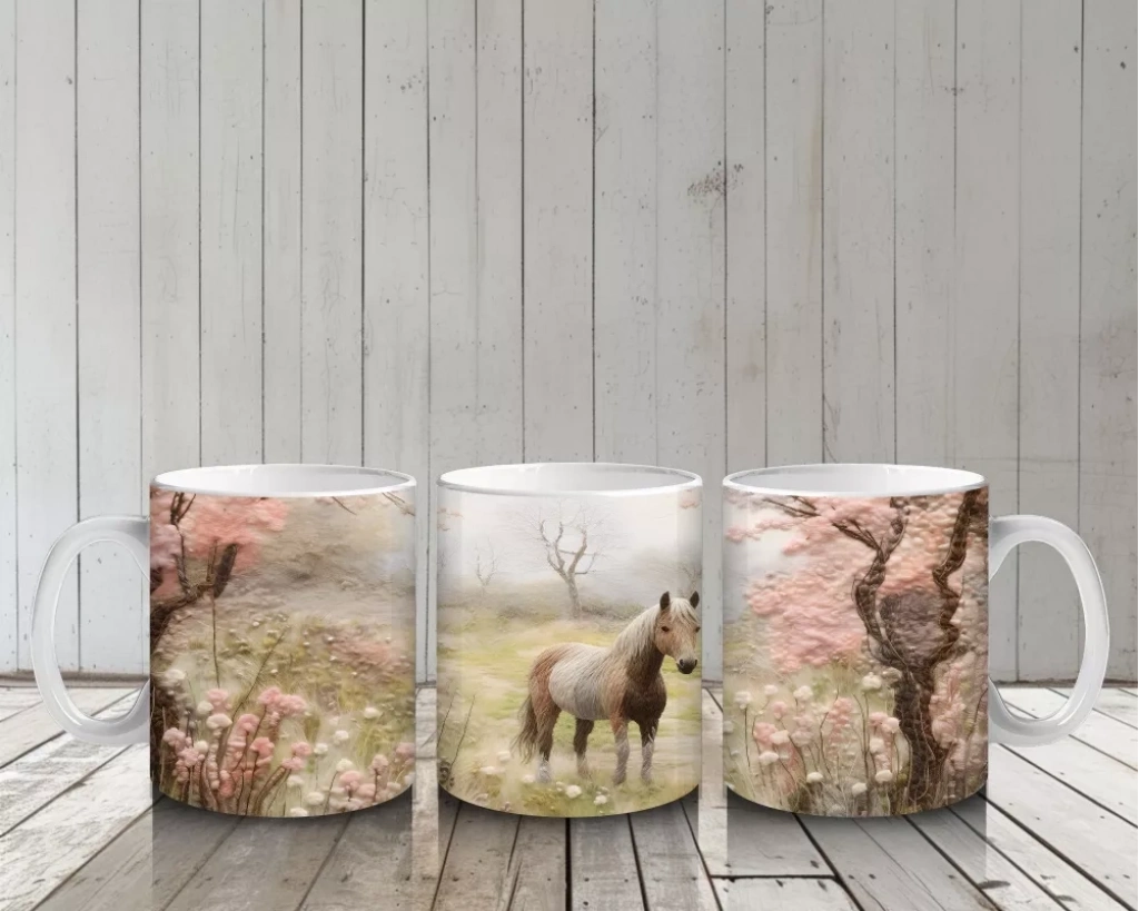 Pembe Çiçekler Arasında Bahar Manzarasında At Silueti – Baskılı Kahve Kupası