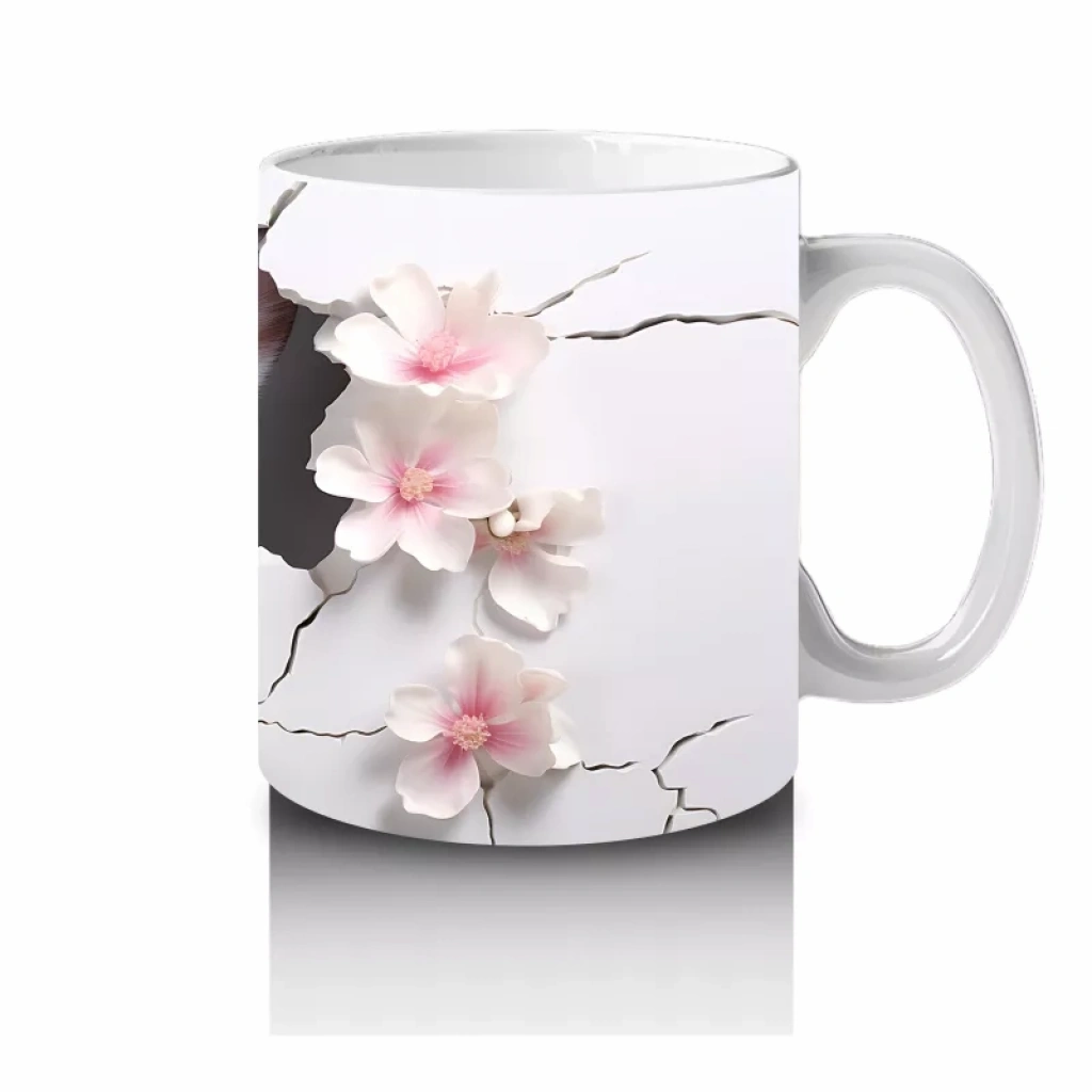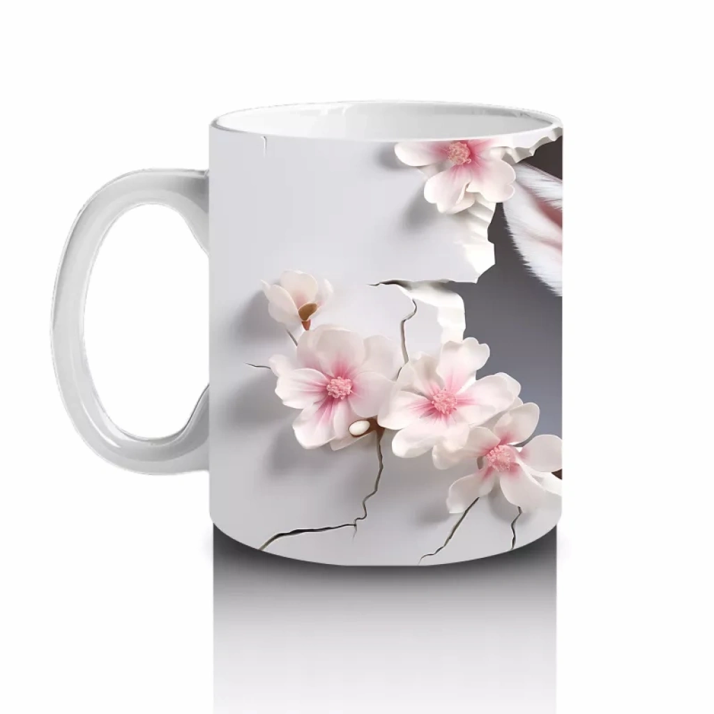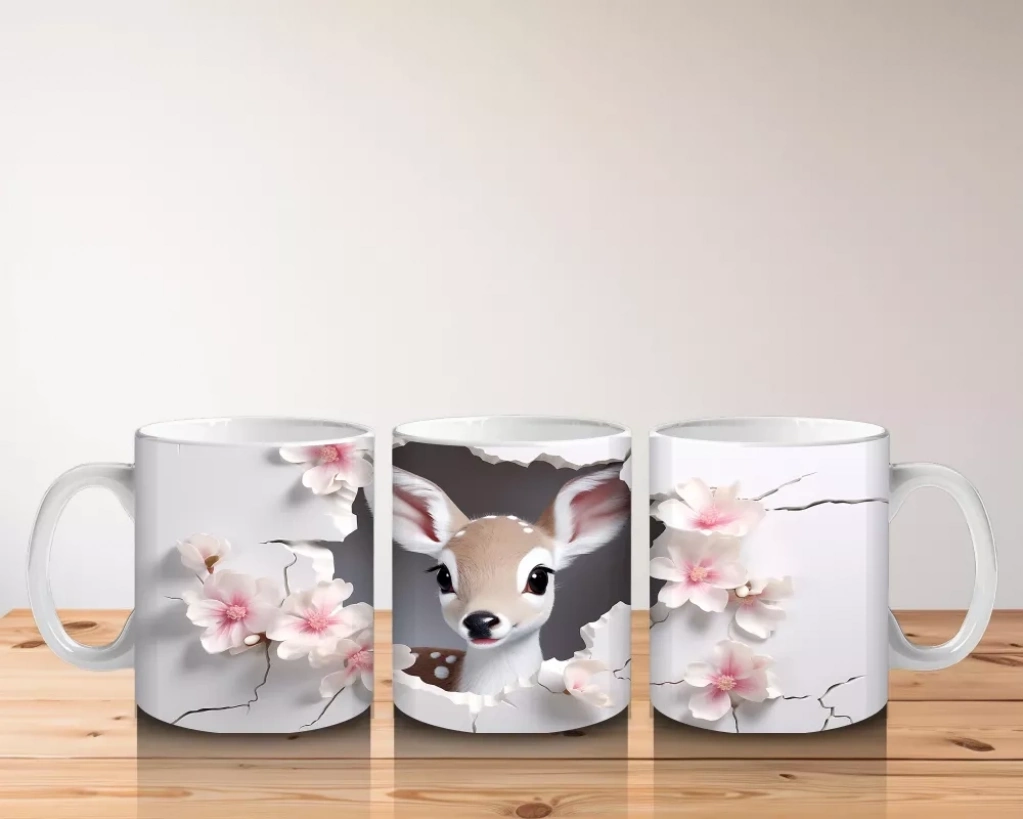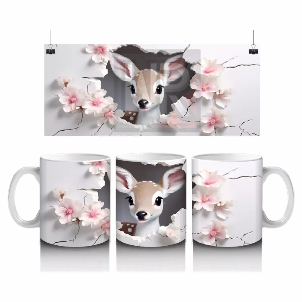Pembe çiçeklerle çevrelenmiş bu sevimli geyik figürü, zarif ve huzur dolu bir atmosfer yaratıyor. Doğa temalı, içten ve romantik bir kupa tasarımı arayanlar için ideal.