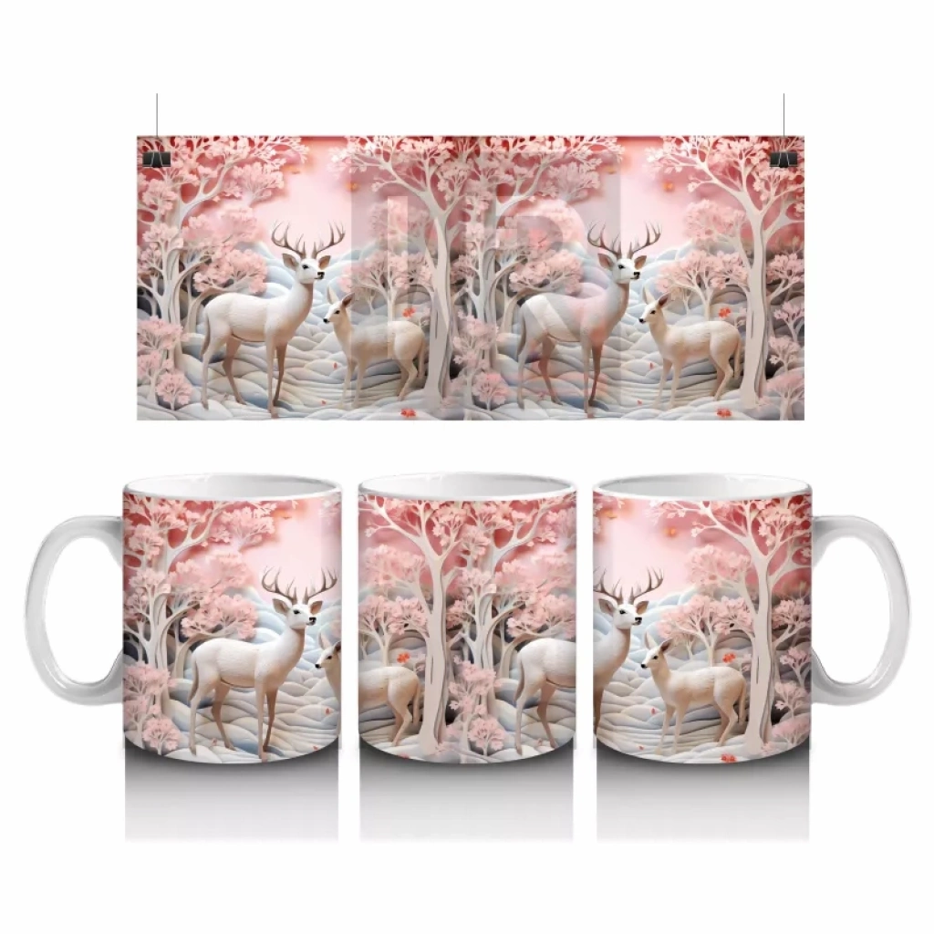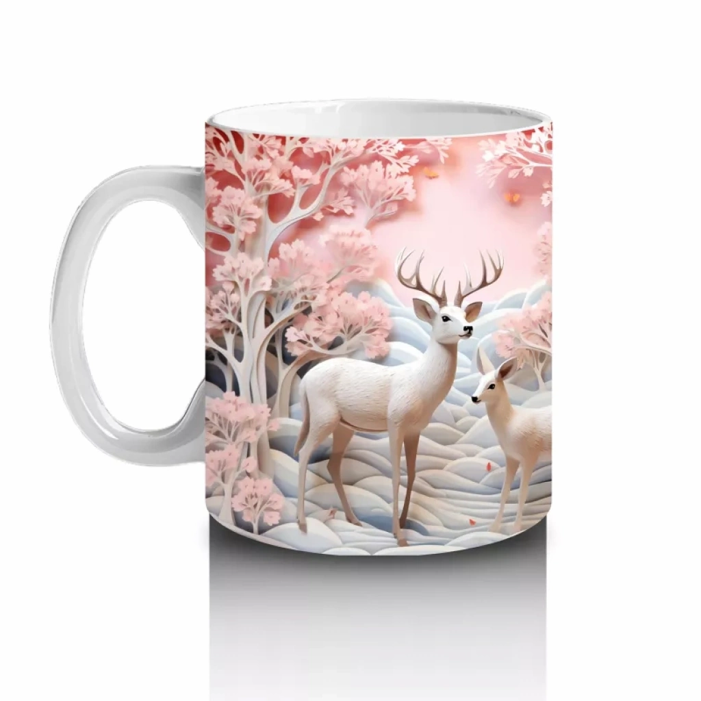 Pembe Çiçekler Arasında Geyik Çifti – Baskılı Kahve Kupası