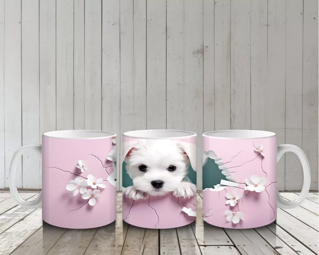 Pembe çiçeklerin arasında yer alan bu tatlı yavru köpek, saf sevgiyi ve neşeyi yansıtıyor. Özellikle romantik ve bahar temalı tasarımlardan hoşlananlara şirin bir kupa alternatifi.