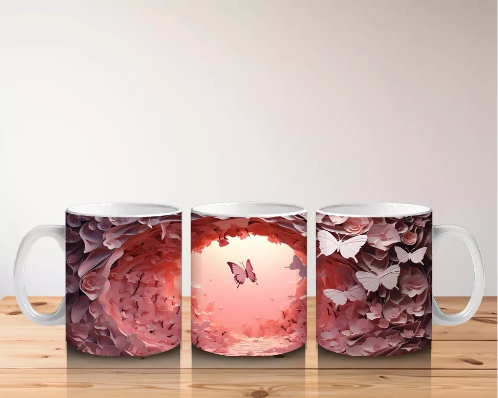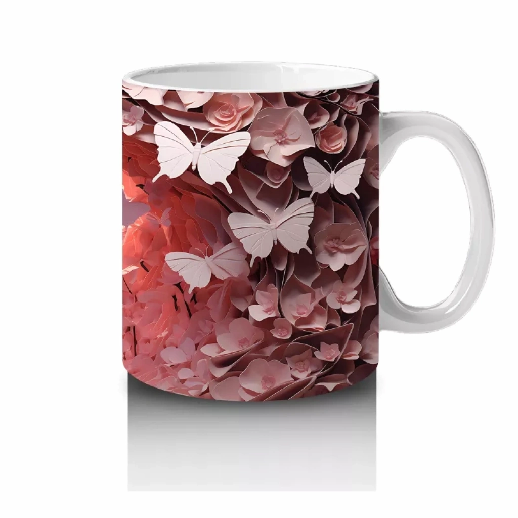 Pembe ışıkların büyüleyici atmosferinde uçuşan kelebekler, romantik ve büyülü bir hava yaratıyor. Duygusal ve etkileyici tasarımlar sevenler için özel bir kupa.