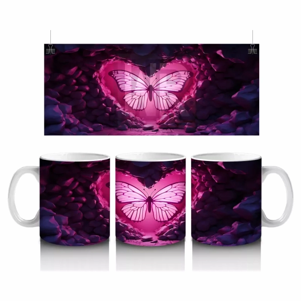 Pembe kalp içinde parlayan kelebek figürü, sevgi ve canlılık dolu bir görünüm sunuyor. Romantik ve enerjik tasarımlar arayanlar için özel bir kupa alternatifi.