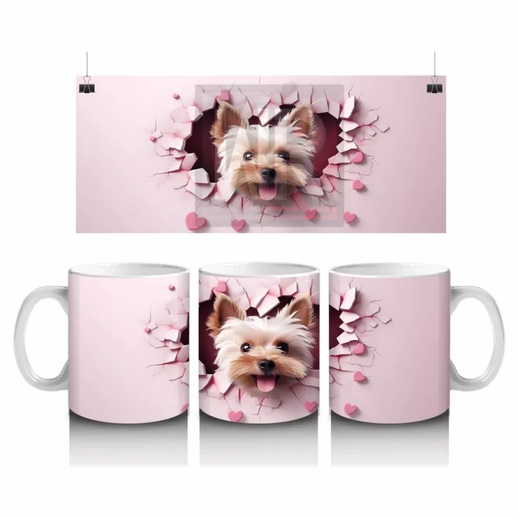 Pembe Kalpli Duvar Arasında Sevimli Yorkshire Terrier – Baskılı Kahve Kupası