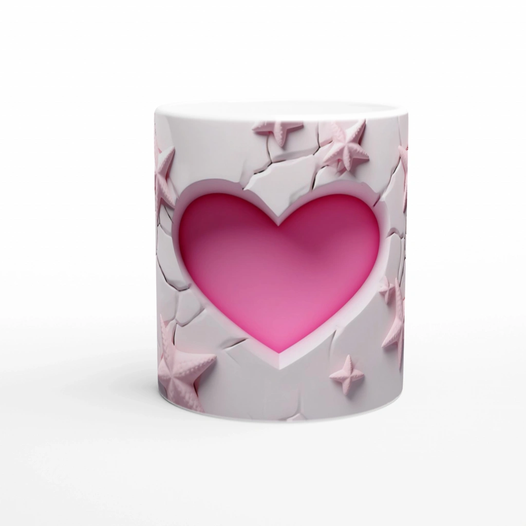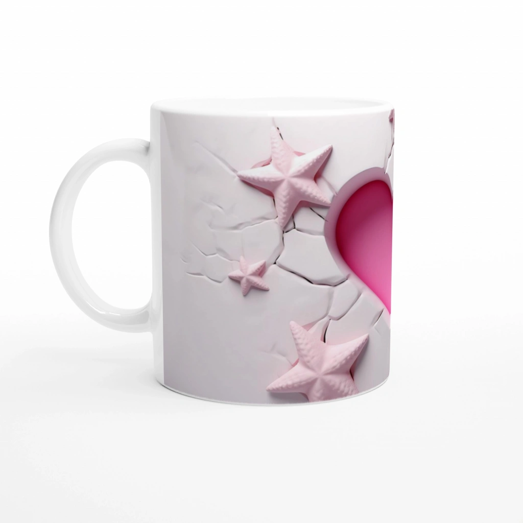 Pembe Kalpli Duvar ve Deniz Yıldızları Temalı Baskılı Kupa Bardak, çatlamış yüzeyin ortasında yer alan kalp şekli ve çevresini saran yumuşak tonlardaki deniz yıldızlarıyla hem romantik hem de ferahlatıcı bir atmosfer yaratır. Sahil tutkunları ve romantik ruhlar için eşsiz bir hediye alternatifi.