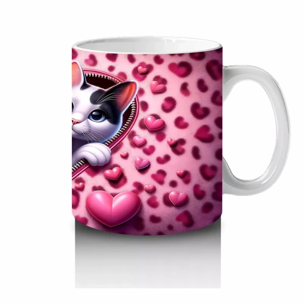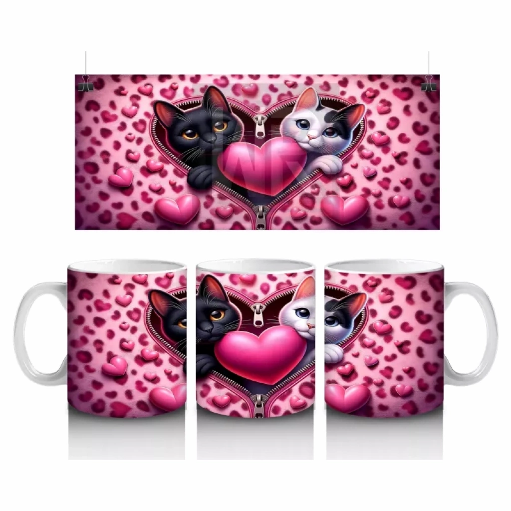 Pembe kalpli fonda yer alan siyah beyaz kedi çifti, zarafet ve sevgi dolu bir atmosfer yaratıyor. Hem şık hem romantik tasarımları sevenler için ideal bir kupa seçeneği.