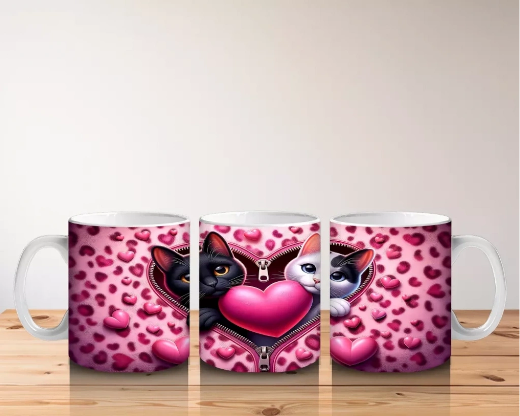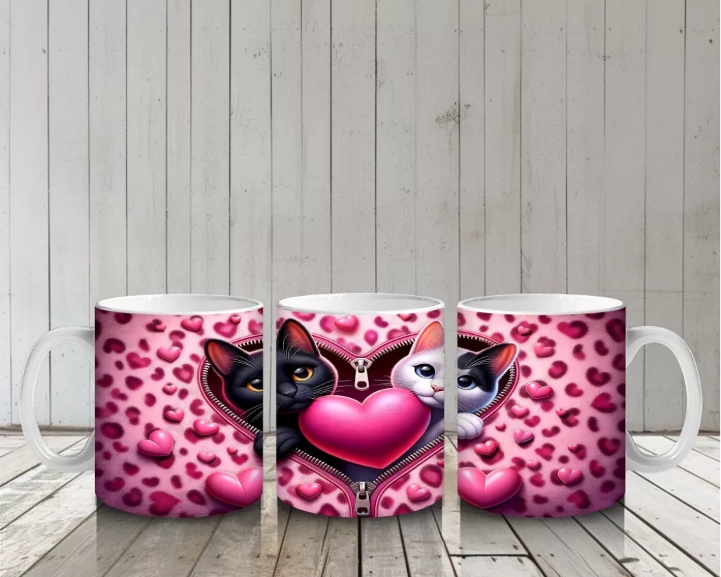 Pembe Kalpli Fon Üzerinde Siyah Beyaz Kedi Çifti – Baskılı Kahve Kupası