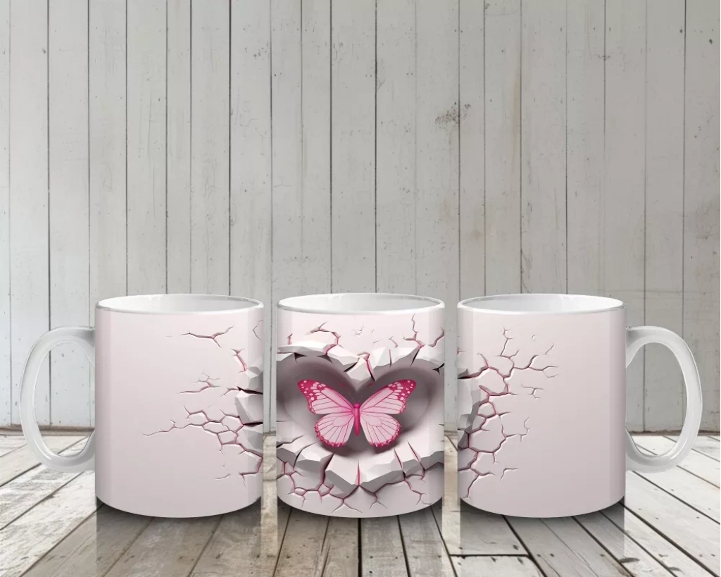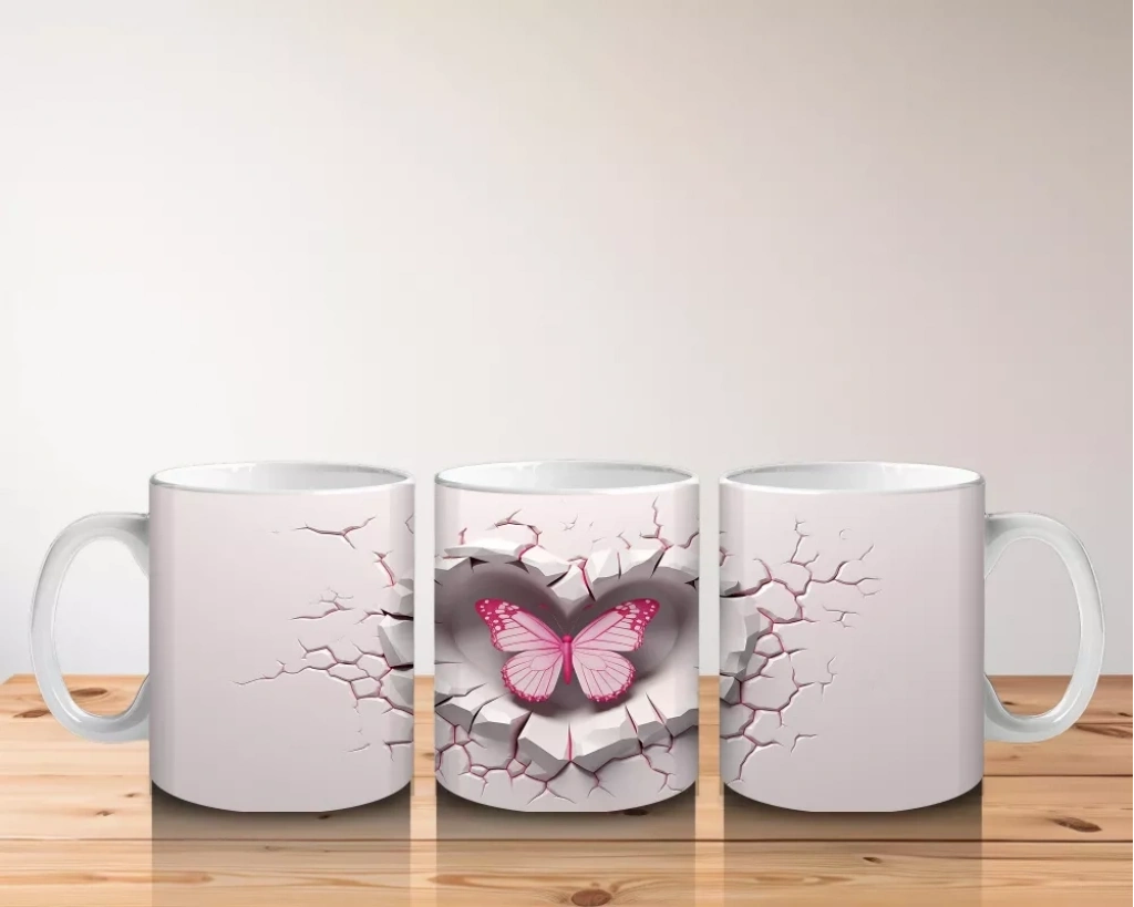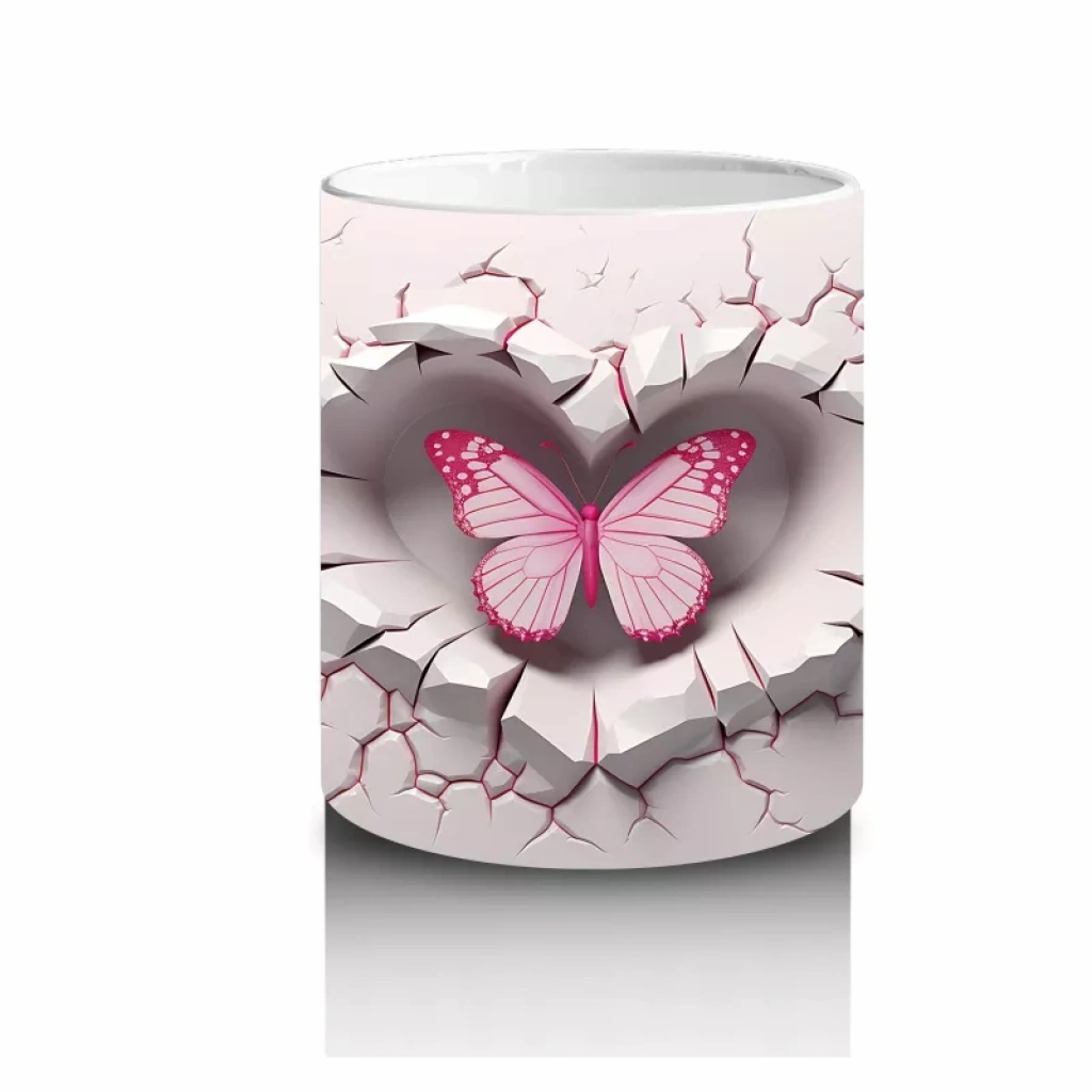 Pembe kelebek figürünün ön planda olduğu çatlak kalp teması, sevgi ve doğallığı bir araya getiriyor. Hem modern hem duygusal detayları sevenler için özgün bir kupa tasarımı.
