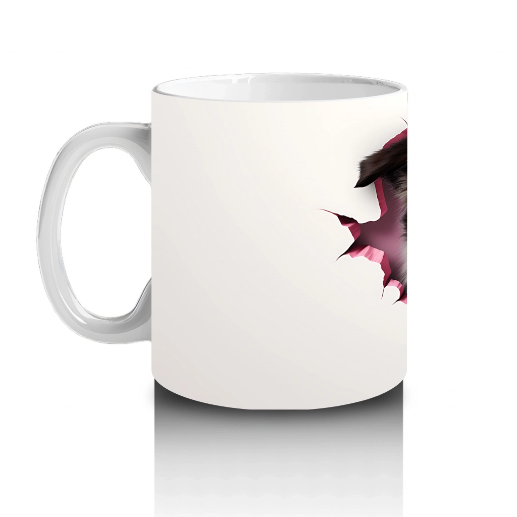 Pembe yırtık etkili desende gülümseyen köpek figürü, sıcak ve neşeli bir atmosfer yaratıyor. Samimi ve modern tasarımlar arayanlar için özel bir kupa.