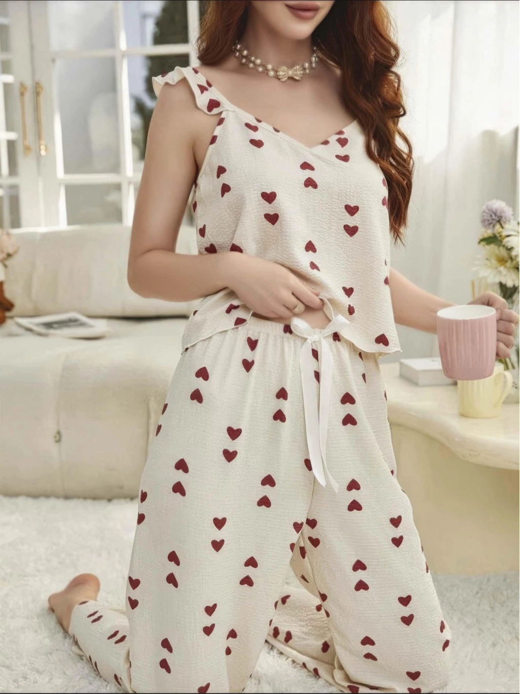 Kadın Ekru Kırmızı Kalp Desenli Yumuşak Pamuklu Uzun Pijama Takımı 5136