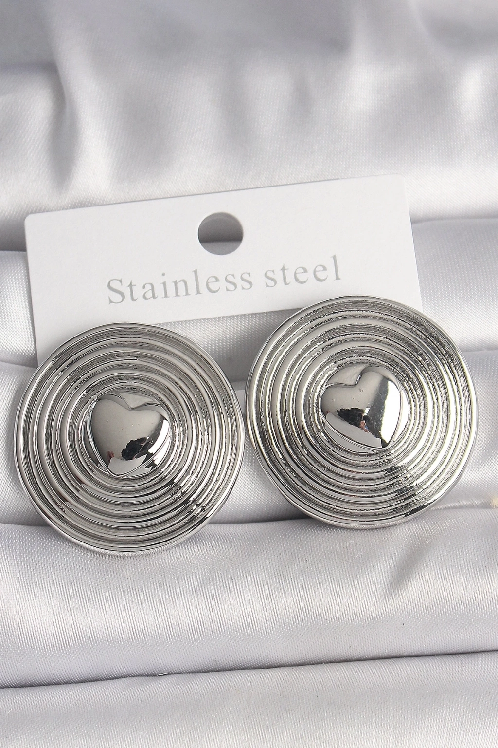 Pirinç Gümüş Renk Kalp İşlemeli Daire Plaka Model Kadın Küpe