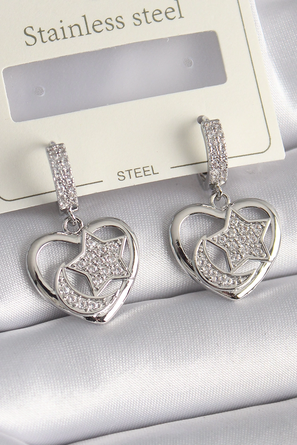 Pirinç Gümüş Renk Kalp Model Zirkon Taşlı Ay Yıldız İşlemeli Kadın Küpe