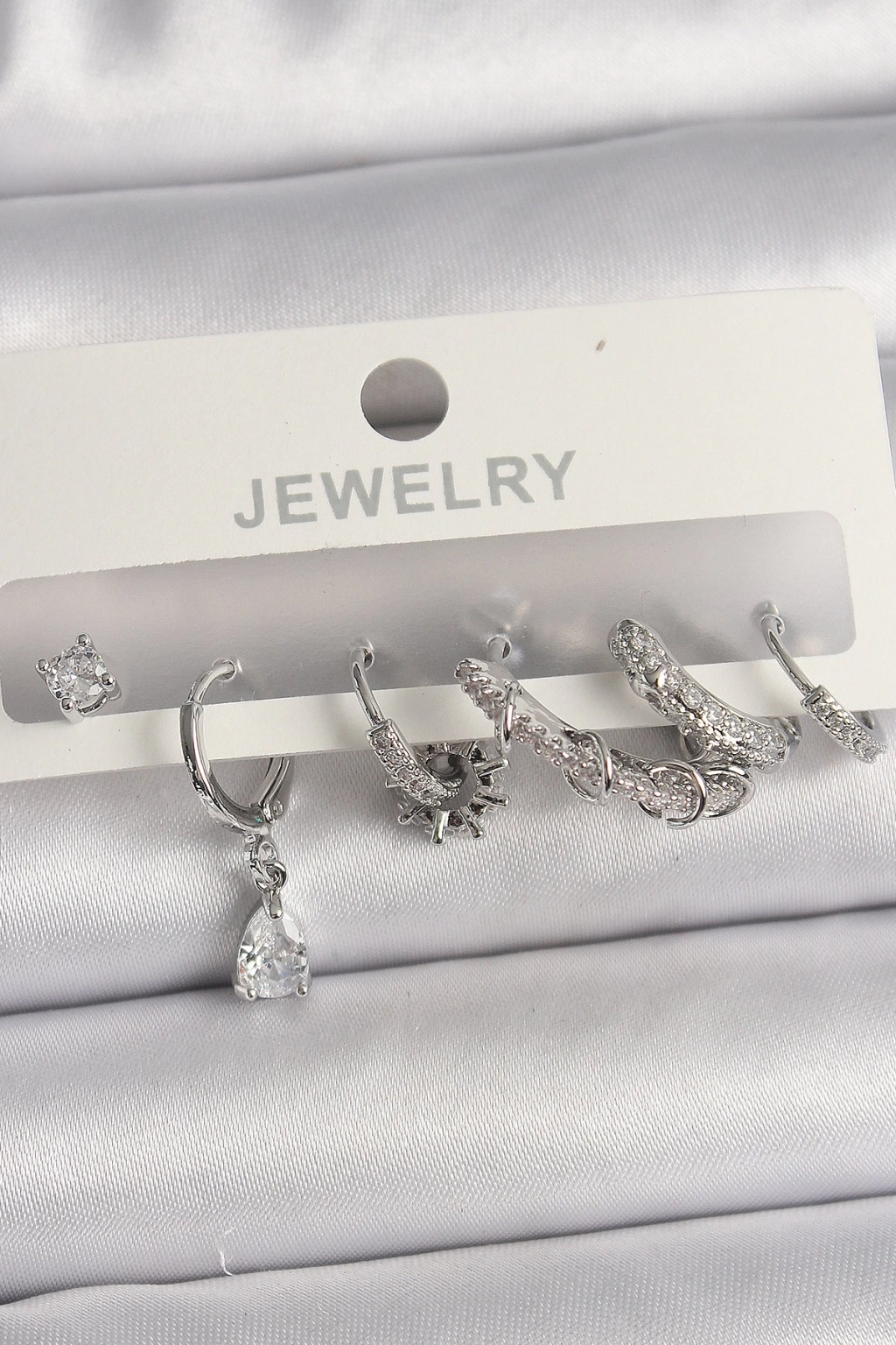 Pirinç Gümüş Renk Sallantı Zirkon Taşlı Halka Model Damla Taş Detay Kadın Küpe Seti