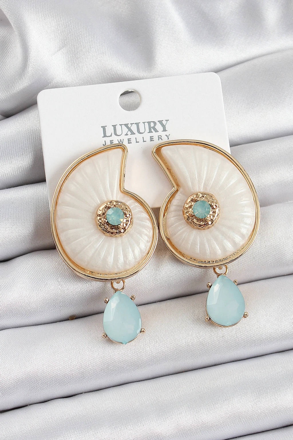 Pirinç Sedef Deniz Kabuğu Figürlü Zirkon Taşlı Gold Renk Kadın Küpe